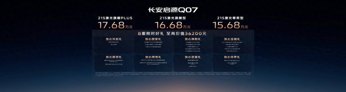 这次上新,Q07天枢智能激光版覆盖215激光旗舰PLUS、215激光旗舰型、215激光尊荣型三款配置,售价区间为15.68万元至17.68万元。上市期间下订即可享受8重专属权益(总价值36200元),五大承诺无死角护航。自上市以来,长安启源Q07持续畅销,9月交付10192辆,累计超6.8万家庭已入手。激光版车型在保持原有视觉版亮点同时,软硬件全线迭代,智能与安全再上台阶。