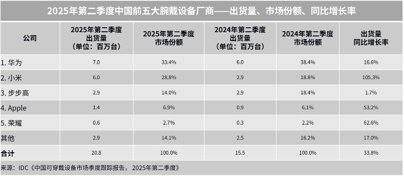 自入局智能穿戴领域以来,华为持续深耕,不断推动行业发展,并赢得了全球消费者的青睐。根据IDC全球可穿戴出货量数据显示,华为成为2025年二季度全球和中国腕戴市场双料第一。其全球市场份额达20.2%,这意味着每五台智能手表中就有一台华为。而且,华为在中国腕戴市场已连续6年出货量第一。