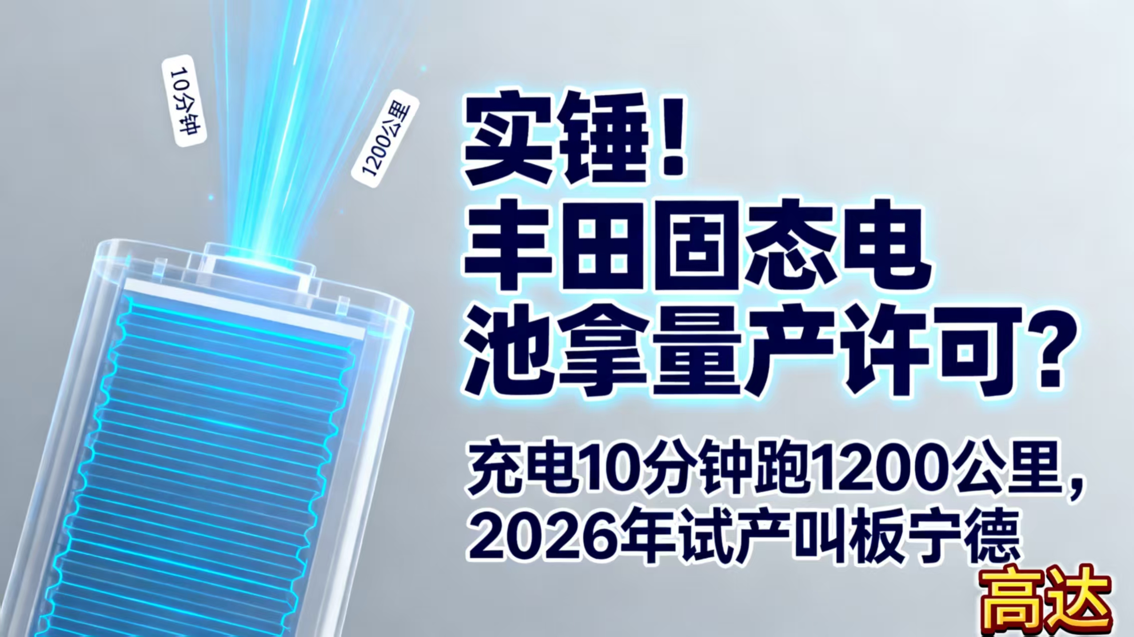 刚刷到丰田固态电池获日本政府量产资质的消息,全网瞬间热议——充电10分钟满电、续航直逼1200公里,2026年日本工厂就启动生产,2027年就能装车!不少人直呼“燃油车彻底被终结”“续航焦虑从此成历史”,更有网友断言“这参数直接拉开与宁德比亚迪的差距”,评论区全是“坐等2027年换车”的期待留言。