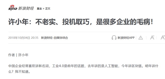 新浪财经2018年10月4日《许小年:不老实、投机取巧,是很多企业的毛病!》报道