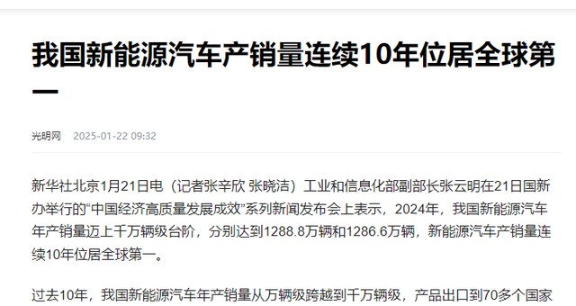 光明网2025年1月22日《我国新能源汽车产销量连续10年位居全球第一》报道