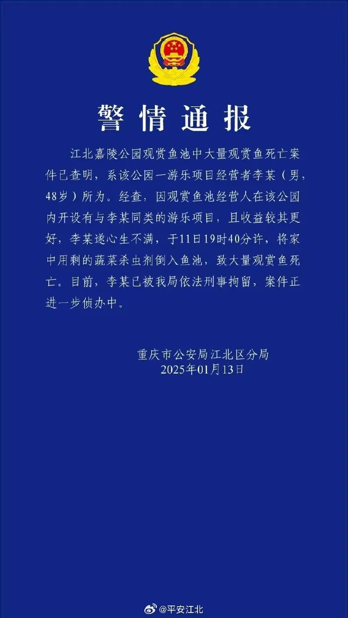 1月13日,重庆市公安局江北区分局发了个警情通报,说江北嘉陵公园里观赏鱼池的鱼突然大批死亡的事儿查清楚了,是公园里一个游乐项目老板李某(男,48岁)干的。
