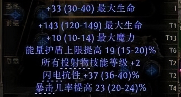 T1 词条:一般指装备词缀的好坏。一个装备由6条T1-T13等多个阶级的词条组成。T阶越高,数字越低,词缀属性就越好。一般情况下T1为最高阶级。