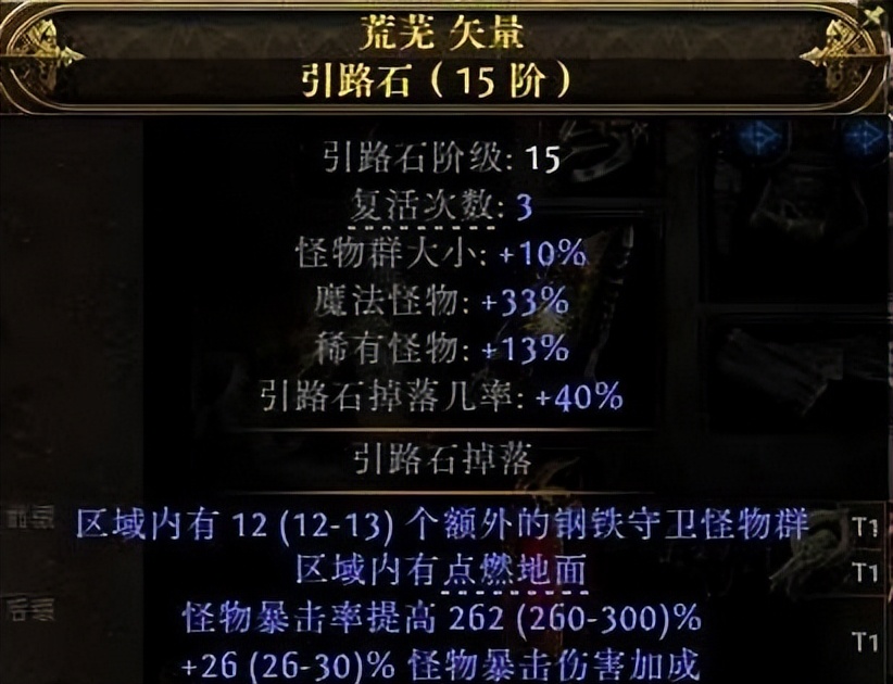 T15地图:玩家指的是15阶的引路石,最低T1-最高T16组成,T阶越高怪物等级越高,怪物的伤害与血量越大,地图难度也就越大。