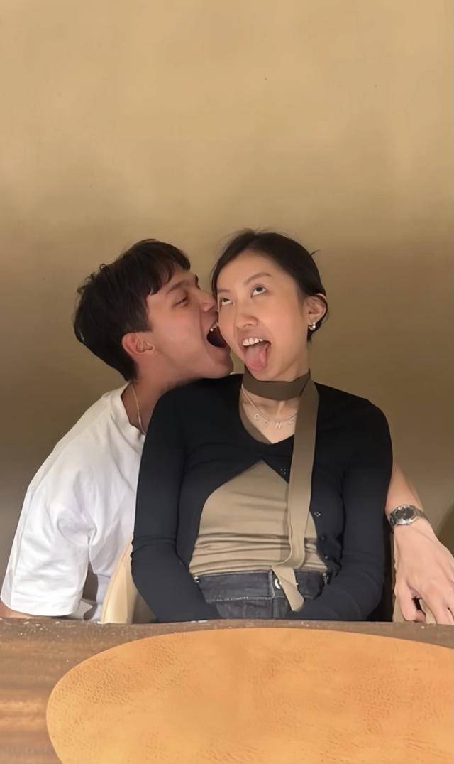 除了陈康堤和男友头贴头的合照外,最吸睛的一定是两人不约而同做出鬼马表情的亲密照,照片中的陈康堤翻着白眼伸出舌头,看起来放飞自我,而其混血男友则是张大嘴巴做出咬女方脸颊的动作,看起来非常有趣。