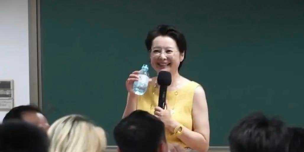 53岁袁立在上海开讲座,她穿着一条黄色长裙,留着短发,身材丰腴,皮肤很白皙,整个
