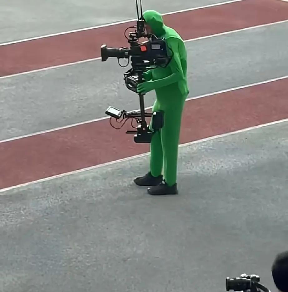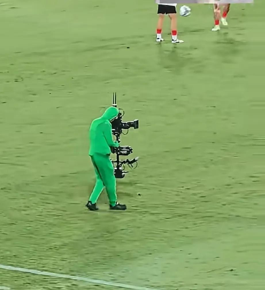 苏超赛场上的绿巨人 足球赛场上因为转播的需要所以要设置较多的转播机位,前几场的比赛就被眼尖的网友发现摄影师多次出现在转播镜头中。 好多网友在评论区给出建议,结果苏州对镇江的这场比赛,场边惊现了绿巨人的身影。 身穿隐身衣的幕后工作者,你们辛苦了,大夏天的还得把自己包裹起来,只为了带给大家最好的直播体验。