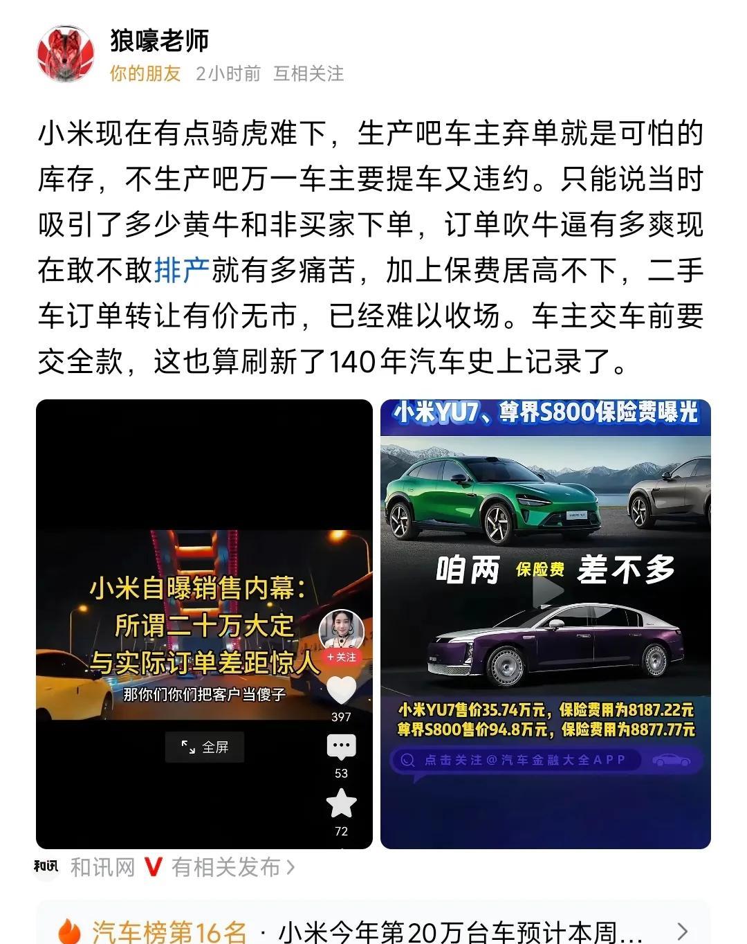 小米目前在针对黄牛订单进行整改。 一些延长提车时间和拒绝提车、频繁更换提车地点的异常账号,都被取消订单、提前要求支付全款。 这对于真实车主来说绝对是好事。 可这却让打手们非常不满,阴阳小米不敢排产、“骑虎难下”,顺便做一下碰瓷营销。 [吃瓜群众][吃瓜群众]“高端品牌”,靠碰瓷小米YU7来做营销,这是老辣第一次见。 说个常识,保费一样的两个不同品牌的车,大多数情况下是因为整车成本相近、维修成本相近。