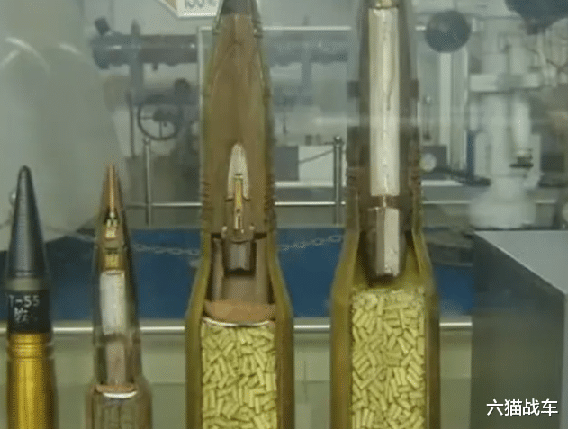 海军上海博览馆内的炮弹剖面模型展品,右侧两发较短的是59式57mm被帽穿甲弹,较长的是76式57舰炮曳光杀伤榴弹,后者药筒无底缘,弹头更细长。图片来自彩云的机械整备间。