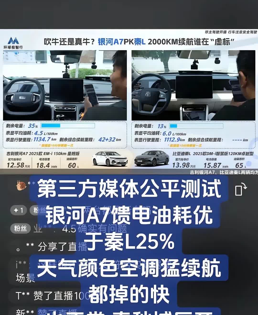 今天看到头条上好多的吉利银河A7和笛子的秦L高速馈电测试, 发布会结束三方的测试就开始, 看到这些数据, 我只能说漂亮, 秦L是2月上市的A7刚上市! 打开汽车之家或者懂车帝对比一下数据, 真实每条数据都比笛子多那么一点, 笛子造车到现在价格战打到现在, 车价一降再降, 成本上和笛子没有办法比, 自己造的东西人家可以控制成本, 其他车企配件都是买的回来的, 简单的道理 自家地里种的菜和你去超市买的菜拿回来做好, 那个省钱, 其他车企材料上压缩到最低都没有利润了, 也只能在这些数据做做文章了, 这两款车都大差不差, 没有会这样去用车, 9成以上的人都是在城市里开, 一年能上几次高速跑2000公里以上, 再说了吉利现在是摸着笛子过河, 今年以来吉利的车车型都是对标笛子的车型, 而且数据都很漂亮, 大哥带你过河, 你把大哥按着摩擦,[呲牙][呲牙][呲牙][呲牙] 我都笑死了。 CC JL 好样的, 国产这么品牌都是好好造车, 但是总有几个搞事情的! 对于老百姓来说就是吃瓜🍉🍉🍉🍉🍉🍉🍉🍉🍉🍉🍉🍉🍉🍉🍉🍉🍉🍉🍉🍉🍉!靠谱便宜都可以,[大笑][大笑][大笑][大笑][大笑][大笑]