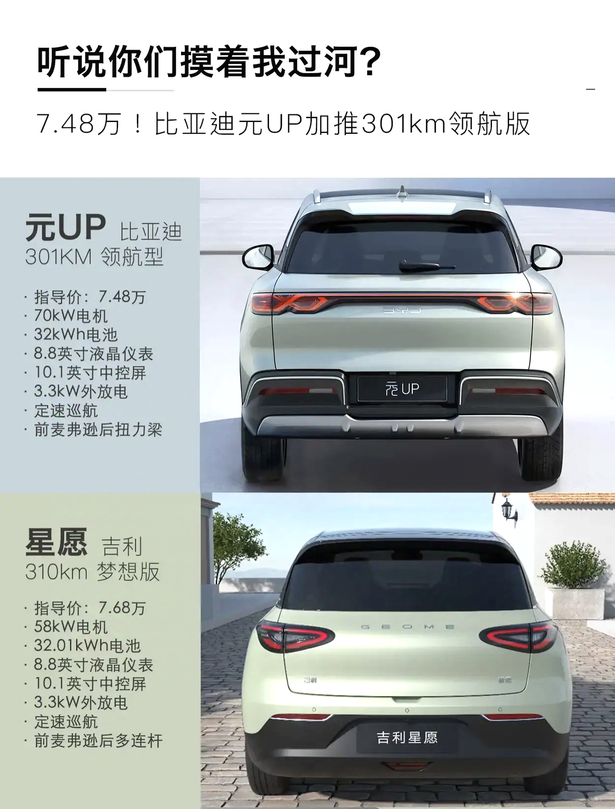 星愿把海鸥打惨了,比亚迪终于开始反击,元up疯起来真是连自家的其它车型一块打,面对星愿有10.1英寸中控大屏幕,32度电池,8.8英寸液晶仪表,3.3千瓦外放电,还支持定速巡航,元up领航版也拥有一模一样的配置,但比亚迪把电机最大功率提升到70千瓦,把最高车速提升到150公里每小时,而且整车比星愿还要重215kg。反观星愿电机最大功率只有58千瓦,最高车速才125公里,所以对于9公里的理论续航差距,相信大多数人都会选择更强的电机。
