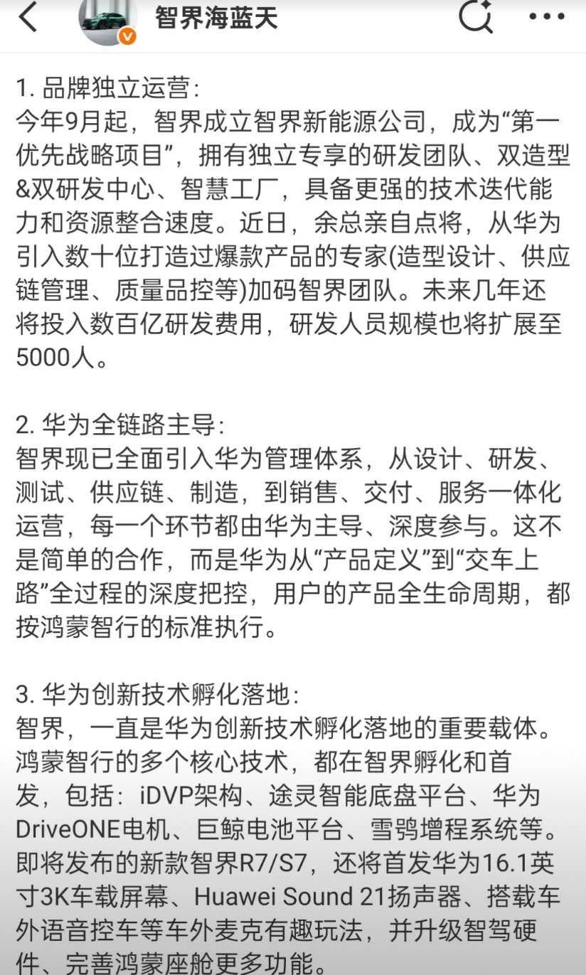 没有退路,华为从奇瑞手中接管智界? 才刚刚官宣,奇瑞与华为的合作便再度升级,智界汽车成立了新公司,由华为全链路主导。 按照智界产品总监海蓝天的说法,智界才是“纯血鸿蒙智行”:引入华为的产品专家、引入华为的管理体系、落地华为的创新技术…… 研发人员也扩充到了5000人! 这回决心不小,看来余承东是真想把智界做起来了。 这个态度,和华为自己造车没区别了。