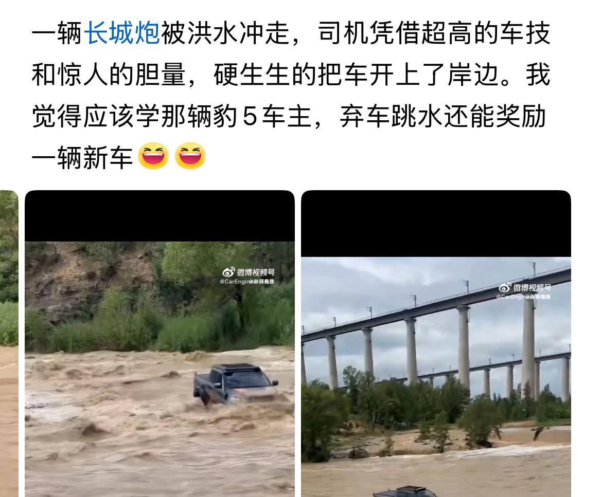 网友:“一辆炮被洪水冲了,但车主凭借超高的车技,把车开上岸了,他应该学豹5车主弃