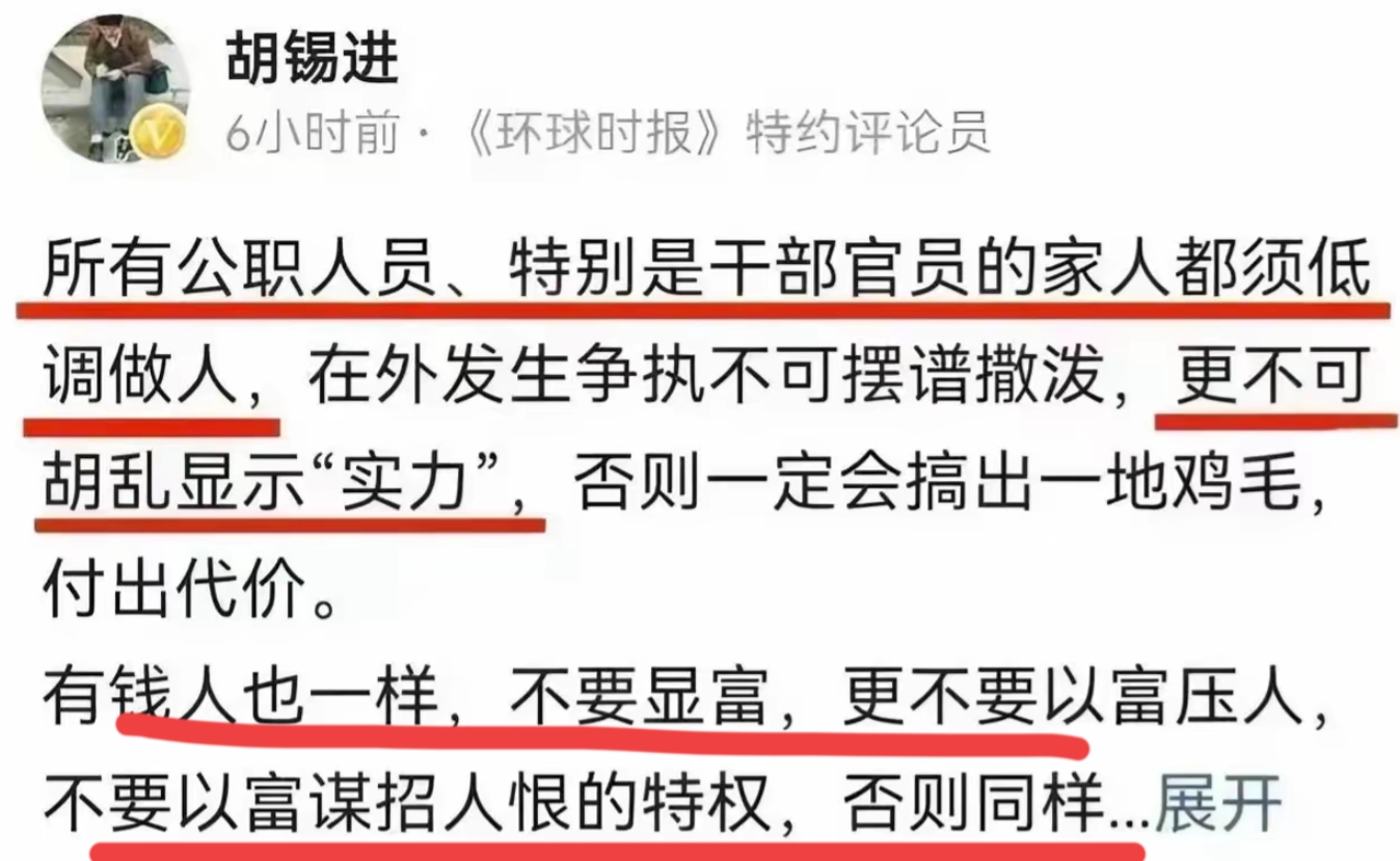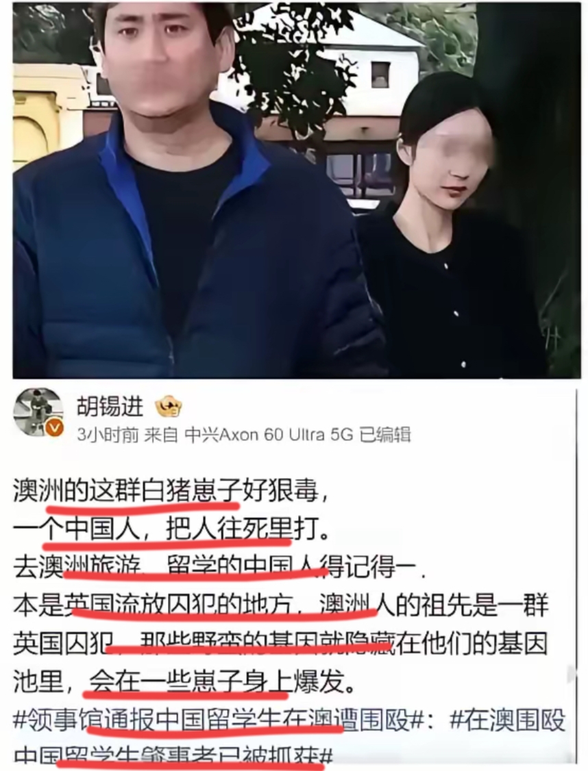 老胡这一次直接发飙了!! 他怒斥发生在澳洲的暴力事件。 这帮白人太过分,太残忍,太狠毒了。 这回,一向温文尔雅的老胡爆了粗口。 他还提醒去到澳洲的旅游,留学的中国人注意; 因为这地方本来就是流放之地,这帮白人基因是改不了的。 不知道什么时候就在这些崽子身上爆发了。 老胡的提醒还是有些道理的。 之前他就不断提醒那些权贵; 千万要低调,不要炫富,不要胡乱显示实力; 否则被人盯上或者举报,一地鸡毛。 老胡看问题还是很现实的,一针见血啊。 老胡不愧是权贵的贴心小棉袄啊。 这是老胡的温馨提醒,懂的都懂,加油!!
