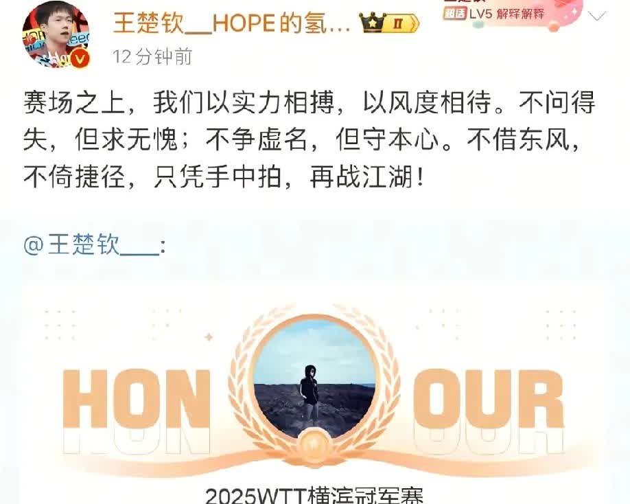 这位粉丝对王楚钦真的是大爱无边,每一句话说的都很真切,我央央大国娇子还惧一个忘本之人,不借东风,不倚捷径,楚钦心里都明白,张本赢得不光明磊落。做人是一辈子对我修养,这就是大国中国运动员的格局。 咱输赢都问心无愧,不耍些小人手段,就看那人耍手段得的奖杯拿着烫不烫手。我们喜欢的就是坦坦荡荡的最优秀的人,所以我们以后会更好!