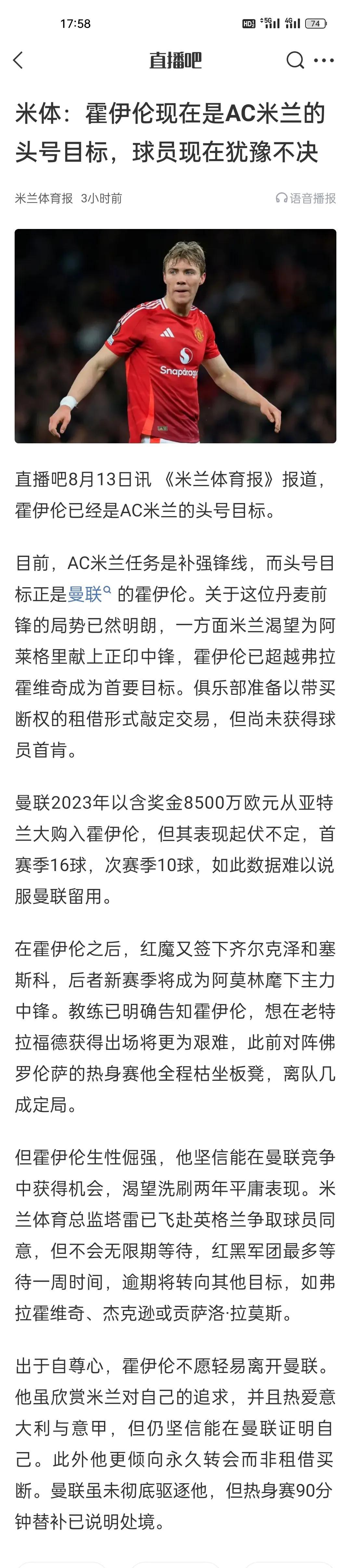 米体:霍伊伦现在是AC米兰的头号目标,球员现在犹豫不决。 唉,其实曼联上下包括咱