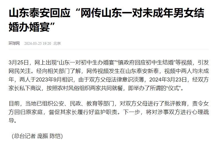 太荒唐了!山东泰安,一初二男生结识了同样十几岁的女生,两人交往几个月后,就约双方父母见了面。让人想不到的是,父母非但没有劝阻,反倒按当地习俗为两人举办了婚礼。相关部门介入调查:两人均未成年,已让女孩回家。 你能想象吗?在山东泰安这样一个地方,一个刚上初二的男生和一个十几岁的女生,短短几个月就走到举办婚礼的地步,父母不但不拦着,还顺水推舟按老习俗办了事。这事听起来像闹剧,可它真真切切发生了,相关部门一查,两人年纪小得还没成年,结局会怎样呢? 这事儿得从当事人说起。男孩住在山东泰安新泰市的一个农村村子,那地方偏僻,周围全是田地和低矮的农家院。他上初中二年级,年纪大概十四岁,身材瘦弱,平时背着书包上学,放学后骑旧自行车回家,偶尔在村口小卖部买点零食,或者刷刷手机看视频。家里条件一般,三间平房,父母靠种地过日子,父亲早出晚归扛锄头下田,母亲在家做饭洗衣,他们文化不高,小学水平,对法律啥的不太懂,管孩子也松散,只管吃饱穿暖,不怎么问学习的事。 女孩住在附近另一个村,离男孩家不远,也就两公里路。她年纪比男孩小点,十三四岁,个头娇小,日常帮父母干家务,早起扫院子,下午有时去镇上买东西,骑电动三轮车载菜。父母也是农民,父亲开拖拉机运东西,母亲在田里拔草,他们对女孩管得不严,只让她按时吃饭睡觉,没太多教育方面的要求。男孩父母一家人挤在简陋屋里,墙壁旧旧的,雨天还漏水,父亲五十多岁,皮肤黑黑的,手上全是老茧,晚上抽烟坐门槛。母亲忙家务,用柴火灶煮饭。 他们习惯听村里老人的规矩,对外面变化不敏感,不看报纸不听新闻。女孩父母家境也穷,靠种小麦大豆维持,父亲借邻居农具干活,母亲闲时编草席卖钱。他们对孩子未来没啥规划,就想着早点帮家里干活,不考虑法律或义务教育的事。这些家庭都嵌在农村日常里,日子过得重复单调,直到男孩女孩相遇才起变化。男孩周末有时去河边钓鱼,女孩节假日随母亲赶集,这样的生活给他们留了自由空间,父母忙生计,没时间监督,导致孩子们接触机会多。 男孩和女孩在2023年9月相遇,那是个秋天,两人通过村口小路碰上,男孩从学校骑车回家,女孩从田间走来,两人简单聊了几句,从此开始联系。几天后在镇上超市外又见面,男孩买了饮料给女孩,两人交换联系方式。接下来的几个月,他们每天用手机发消息,男孩放学后发课堂笔记,女孩在灶台旁回复。一次周末去村外小溪边玩,另一个傍晚在田埂散步,两人关系拉近。 几个月后,男孩提让父母见面,女孩同意。2024年3月初,两家父母在男孩家聚齐,桌上摆茶和菜,男孩父母斟茶,女孩父母带腌菜,大家商谈后决定按村俗办事。3月23日办仪式,村里院坝支桌,邻居来贺,男孩穿借来西装,女孩裹红头巾,父母交换礼品,男孩给女孩套环,宾客鼓掌,整个过程简单喧闹。父母们就这样把事定了,没想过法律问题。 视频在3月25日传到网上后,镇政府马上派人查,工作人员去男孩家谈话,指出违法,父母低头听。公安、民政、教育部门记录笔录,解释法规,强调义务教育。女孩被护送回家,母亲接她进去。男孩继续上学,父母接受批评后出门干活。专业人员安排心理指导,男孩女孩分别在办公室画图跟随指令,分次进行。女孩留在家由父母监督,男孩专注课业,两人分开回归原生活,村里平静下来。 这事儿说白了,就是农村一些地方习俗和法律脱节闹出来的。男孩女孩年纪小,本该在学校学知识,接触世界,可父母一脑热就办了婚礼,这不光违法,还耽误孩子前途。法律上,结婚年龄男22女20,两人远没到,婚姻无效。义务教育阶段,父母没尽监护责,让孩子早早辍学或分心,这属于违法。父母法律意识弱,盲从风俗,不负责任,对孩子未来没考虑周全。 社会上类似事不时有,反映出农村教育和普法不足。相关部门介入及时,批评教育,责令回归家庭,进行心理疏导,这步走对,避免更大问题。长远看,得加强基层普法,让父母懂法守法,别让习俗害了下一代。孩子身心不成熟,婚姻责任重,他们扛不起,早婚早育往往带来贫困循环。数据显示,早婚家庭离婚率高,孩子教育差,影响社会稳定。父母该多学点法律知识,别一味宠孩子或随大流。事件曝光后,网上议论多,提醒大家重视未成年保护。 女孩回家后,父母监督起居,男孩上学不闲逛,这算及时纠错。可惜父母没早醒悟,导致孩子经历这番折腾。心理疏导重要,帮助孩子调整心态,别留阴影。整个过程,官方处理稳当,没拖泥带水。相比其他地方隐瞒,这儿公开回应,好评。农村风俗有根深,但得与时俱进,不能违法。男孩女孩未来还长,希望他们吸取教训,好好学习。父母也该反省,别再犯傻。社会需要更多这样的案例教育大家,提高警惕。 这事儿闹得沸沸扬扬,你觉得父母错在哪儿?孩子该怎么面对未来?欢迎留言分享看法,一起讨论未成年保护。