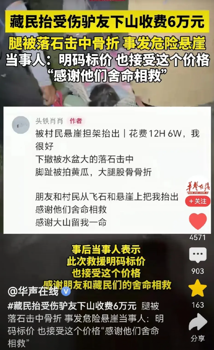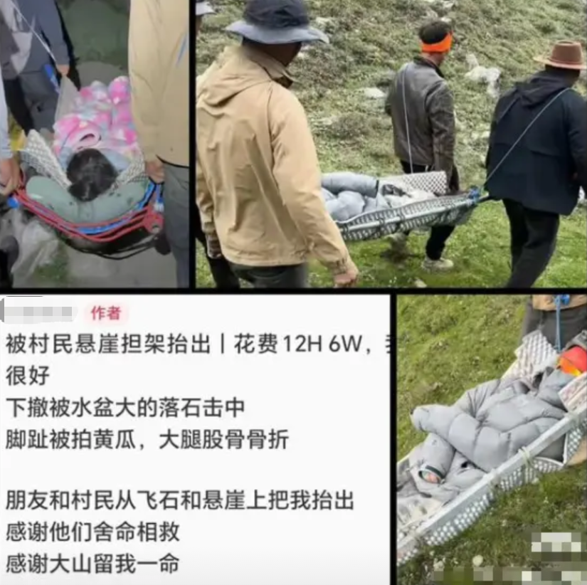 另一边素质高,事后没有反悔,爽快给了6万,并很感谢藏民“舍命相救”。 八月初的四川勒多曼因雪山,天气变幻莫测。一位女驴友正和同伴挑战这条高难度徒步路线时,意外突然降临,一块“水盆大”的落石从高处滚下,精准地砸中了她的腿部。 剧痛瞬间传遍全身,脚趾粉碎性骨折、大腿股骨断裂,她倒在海拔4000多米的悬崖沟槽地带,完全丧失了行动能力。 同伴们尝试背她下山,但在乱石嶙峋的陡坡上根本行不通。落石还在不断滚下,两人只能一个护头、一个护腿,用背包将她拖到相对安全的位置。 卫星电话拨出去后,等来的不是专业救援队,而是当地马帮带来的十名藏族村民。面对命悬一线的伤者和持续落石的危险环境,这些藏民没有退缩,但也没有空谈道义。 “抬下山需要六个人,每人一万,总共六万”救援报价直接明了。女驴友躺在担架上,忍着剧痛快快答应。在生死关头,这六万元换一条命的交易当场敲定。 十位藏民组成的临时救援队面对的是,一条连山羊都难以行走的险路。他们用简易担架抬起伤者,在海拔四千米的稀薄空气中,开始了这场持续十二小时的生死跋涉。 脚下是陡峭的悬崖,头顶是随时可能滚落的飞石。这些藏民多年在山区劳作,对地形了如指掌,但抬着担架穿越这样的地带,依然步步惊心。 最初约定的是六人救援,但当他们真正走上这条险路时,才发现**六个人的力量远远不够。 藏民们没有坐地起价,而是默默增加了人手。最终十人轮换抬担架,却依然只按原定的六万元收费。 “路况太差了,差到6个人都无法将女孩顺利抬回去。”一位知情者这样描述当时的困境。藏民们临时调整方案,用团队协作化解危机,却信守承诺不增费用。 伤者后来在网络上回忆这段经历时,用了 “舍命相救” 这个词。这绝非夸张——在持续落石的环境中,每一次抬步都是与死神的擦肩而过。 消息传开后,六万元的救援费在网络上掀起波澜。有人惊呼“天价”,但细算之下,这笔账却呈现出另一番面貌。 十人参与救援,十二小时连续作业,总费用六万元。分摊下来,**每人实得六千元,时薪约五百元。 有专业人士指出,这远低于矿工、高空作业等同等风险职业的报酬水平。更何况在高原缺氧环境下进行高强度体力劳动,危险系数倍增。 “6万买了一条命,简直太值了!”户外博主在社交平台上这样评价。他的观点代表了许多户外爱好者的心声,在生死攸关的时刻,能用钱解决的问题都不是问题。 在类似的高山环境中,出动一次商业救援直升机费用动辄超过三十万元。对于那些没有购买专项救援险的驴友来说,藏民的人力救援成了最实际的选择。