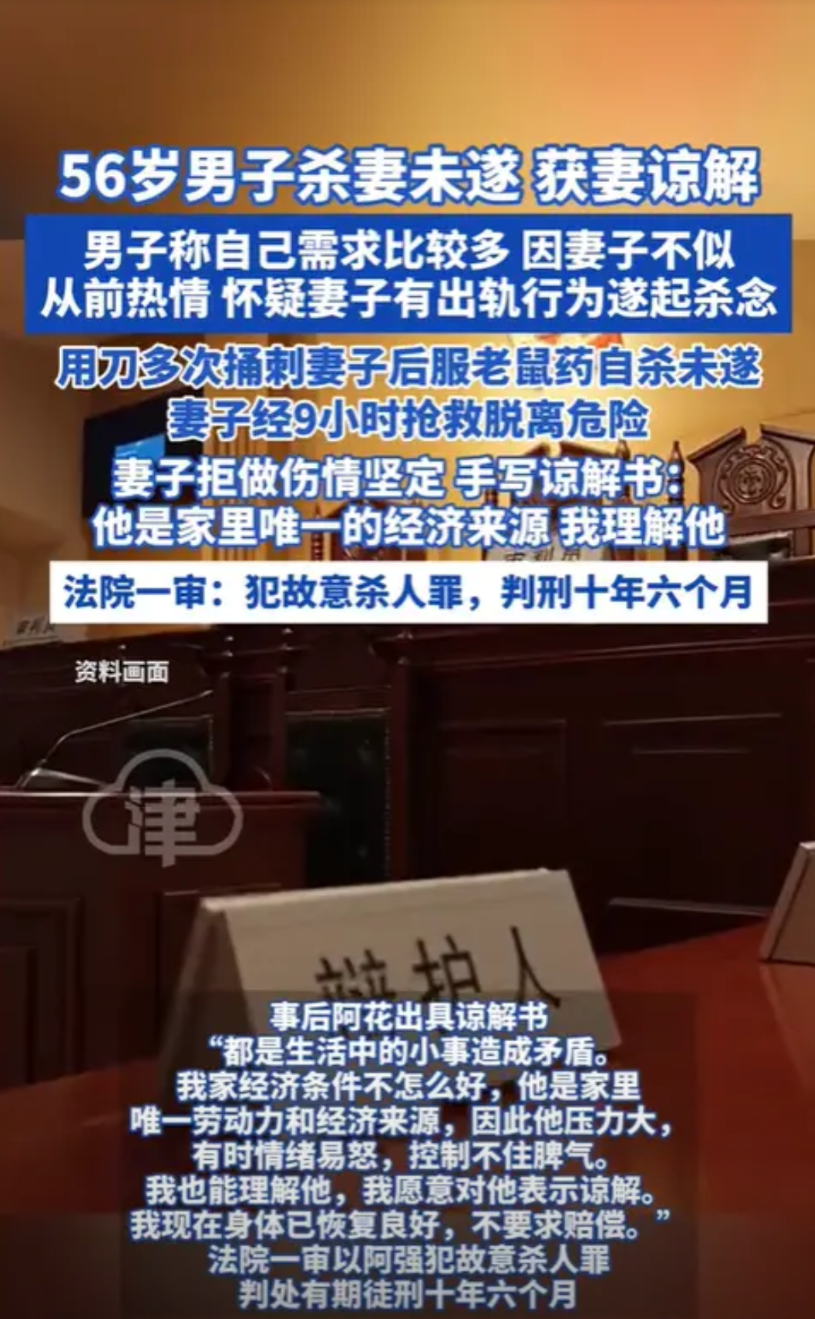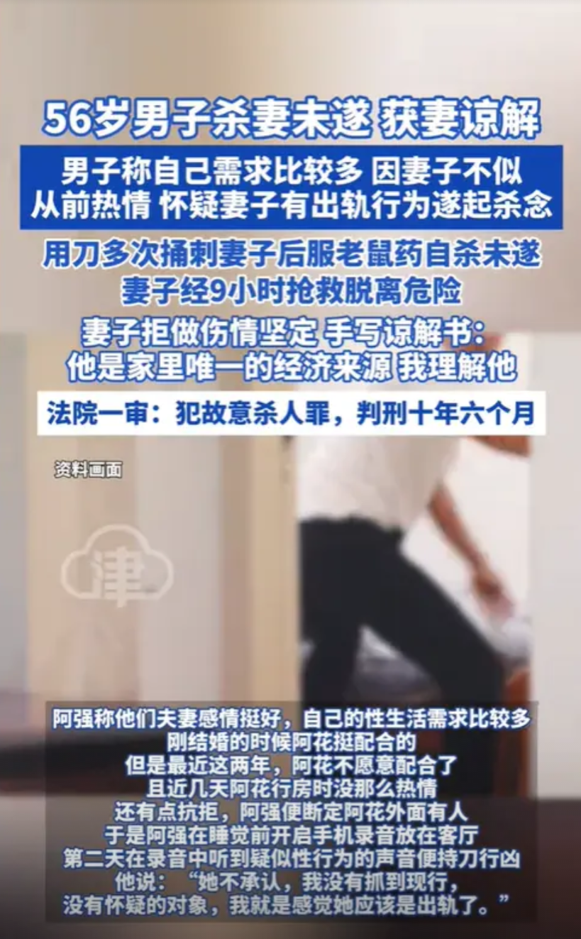 吉林,一56岁男子平均每天都要和妻子行房,可妻子却没了兴致,男子怀疑妻子出轨,于是持刀捅了妻子几刀,随后服老鼠药自杀,但未能成功。然而妻子康复后却坚持要出谅解书,称男子是家庭收入来源,家里不能没有他。法院判了!