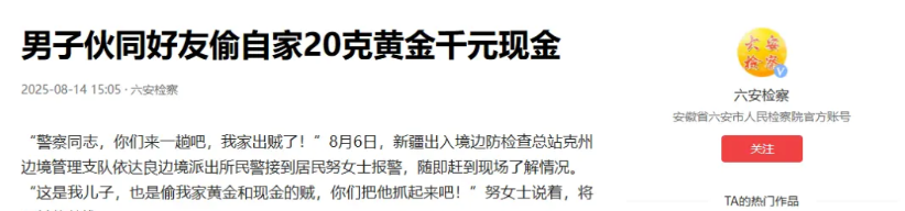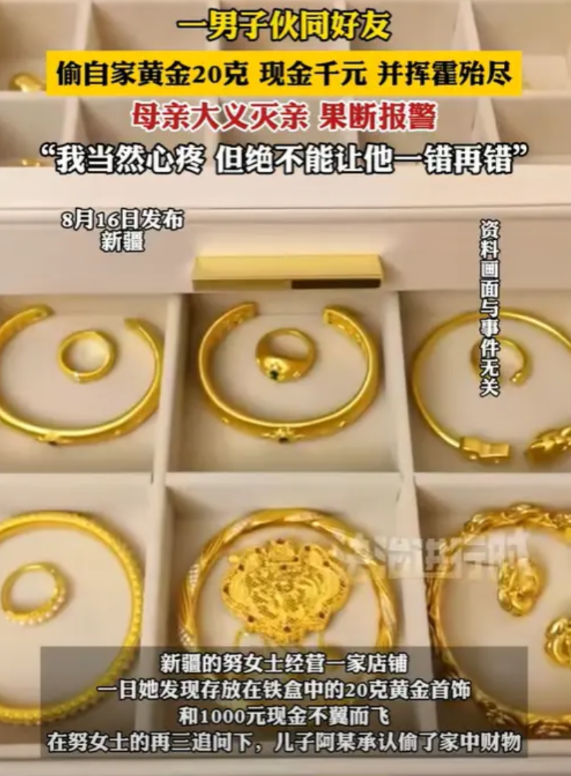 大义灭亲!新疆,一女子营业一整天,结果晚上清点数目时却发现丢了1000元,连同放在盒子里的20克黄金也不见了。女子调查后发现竟是她儿子伙同好友偷走的,可她并没有姑息,而是果断报警:做错事就要接受惩罚,他是我儿子,我当然心疼,但不能让他一错再错!   “家里进贼了!居然少了这么多钱!”韩女士(化名)结束营业后发现现金和黄金都少了!她十分惊慌的叫来丈夫开始调查,结果却发现,偷走这些东西的居然是自己亲儿子!   韩女士开了家小店,平时生意挺红火,店里除了韩女士也就只有其他一个员工,俩人轮替着看店,售卖产品。韩女士有个儿子,自从毕业以后就游手好闲,找不到正经工作。   有时候上班也不认真,总是去几天不去了。所以,韩女士店里繁忙的时候,就会让儿子来帮个忙,打个下手。   事发当天,忙碌了一整天的韩女士,在晚上关店前准备清点当天的收入。她熟练地拿出装钱的铁盒子,可当她清点完毕后,居然发现少了1000 元现金!更让她揪心的是,那盒子里放着自己20 克的黄金也不见了踪影。   她的心跳瞬间加速,她第一反应是可能自己放错了地方,于是开始在店里四处翻找,甚至连平时不怎么用到的抽屉都仔细查看了一遍,可始终没有找到。   她坐下来,努力让自己冷静,开始回忆白天店里的情况。店里一直是她和另一位店员在照看,儿子是下午才来。来了以后,自己上厕所和吃晚饭的时间都是儿子在看店。   不过,儿子平时看着也挺懂事,可今天下午,有一段时间神色有些慌张,还借口出去买东西,离开了好一阵子。韩女士越想越觉得不对劲,一种不好的预感涌上心头。   她悄悄观察儿子,发现儿子面对她时,眼神总是躲躲闪闪,而且儿子不上班没收入,自己也不咋给他钱,但他经常买点小玩意回家。带着疑虑,韩女士旁敲侧击地问儿子,有没有看到盒子里的钱和黄金。   儿子一开始还矢口否认,可在韩女士不断追问下,他的情绪越来越紧张,最后终于绷不住,承认了是自己拿走了钱和黄金!   原来,儿子和朋友最近迷上了去网吧打游戏,还经常去一些娱乐场所,开销越来越大,自己的零花钱根本不够用,鬼迷心窍之下,就把主意打到了店里的钱和黄金上。   他趁着韩女士不注意,和朋友一个行动一个放哨,偷偷拿走了钱和黄金,然后把钱挥霍在玩乐上,黄金也被他拿去卖掉,换了钱继续潇洒。   得知真相的韩女士,心里像被刀割一样疼。那是她的儿子啊,是她用心呵护长大的孩子,怎么会做出偷盗这样的事情!   但她很快冷静下来,她想到,如果这次不加以制止,儿子很可能会在错误的道路上越走越远,以后可能会犯下更严重的错误。   于是,尽管内心充满了痛苦和不舍,韩女士还是毅然拿起电话,报了警。掌握全部犯罪证据后,民警当即展开抓捕,儿子和同伙等3人落网。   目前,该案已移交公安局刑事侦查大队,正在进一步侦办中。   对此你怎么看?欢迎大家在评论区留言讨论。