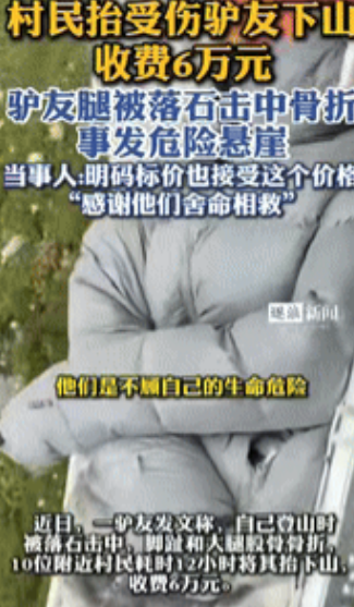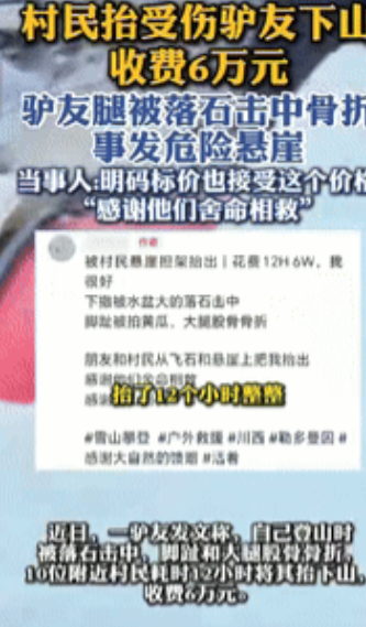这钱花得值吗?”四川,一女子在海拔超4000米的落石高发区徒步时,不小心被落石击中,导致脚趾粉碎性骨折,同伴尝试背运失败后,便联系了当地人,对方愿意派10名藏民,轮班把女子给抬下去,但要收费6万元,女子欣然答应,事后还感谢藏民舍命相救! “能活下来已经很不容易了,太感谢他们了!”女子激动的说道,这句充满感激的话语背后,是一场发生在四川贡嘎雪山海拔4000米悬崖边的生死救援,当一名女驴友在徒步时被落石砸成重伤,10名藏民冒着生命危险将她从死亡线上抬回,却因6万元救援费用引发全网热议。 事发当天这名女子与同伴正在川西高原的徒步路线上前行,这里海拔超过4000米,地形险峻,是典型的落石高发区,突然间一块巨石从山崖滚落,精准地击中了她的腿部,剧痛瞬间袭来,她倒在地上无法动弹,同伴检查后发现,她的脚趾已经粉碎性骨折,大腿也出现严重骨折,完全失去了行走能力。 更糟糕的是他们身处悬崖边缘,上方不时有碎石滚落,随时可能发生二次事故,同伴试图背她下山,但在陡峭的山路上,这个尝试很快以失败告终,眼看天色渐晚,气温骤降,女子的意识开始模糊,同伴紧急拨通了当地向导的电话。 接到求救后当地藏民迅速组织了10名精壮男子赶往现场,他们深知这片区域的危险性——落石随时可能再次发生,高海拔地区体力消耗极大,稍有不慎就可能连人带担架坠入深渊,但面对生命垂危的游客,他们没有丝毫犹豫。 救援过程堪称惊心动魄10名藏民分成两组轮班,用简易担架固定住伤者,在几乎垂直的悬崖上缓慢移动,他们用身体挡住滚落的碎石,用绳索相互保护,每前进一步都要付出巨大体力,经过近10小时的艰难跋涉,终于将女子安全转移到山下医疗机构。 当女子得知救援费用是6万元时她毫不犹豫地答应了,“在那种情况下,能用钱换回生命,太值得了!”事后她回忆道,这笔费用包含了10名救援人员的人力成本、设备损耗以及高风险作业的补偿,要知道在海拔4000米以上的危险区域进行救援,对救援人员的体能和心理都是极大考验。 这起事件在网络上引发激烈讨论,一位网友留言道:“很多人没去过高原,不知道那里的救援有多难,6万元分摊到10个人身上,每人6000元,还要扣除设备成本,冒着生命危险工作十几个小时,这个价格其实很合理,要知道,在珠峰地区,一次直升机救援要几十万呢。” 另一位网友则表示:“我们总说生命无价,可真到了要花钱救命的时候,又开始计较价格,这些藏民兄弟世代生活在高原,对地形最熟悉,没有他们,这位女子可能就回不来了,6万元买条命,我觉得值!” 这起事件也给我们敲响警钟:进入高原徒步前,一定要做好充分准备,购买专业保险,了解当地救援费用标准,毕竟,在大自然面前,人类永远需要保持敬畏之心。 对此你怎么看?欢迎大家在评论区留言讨论。