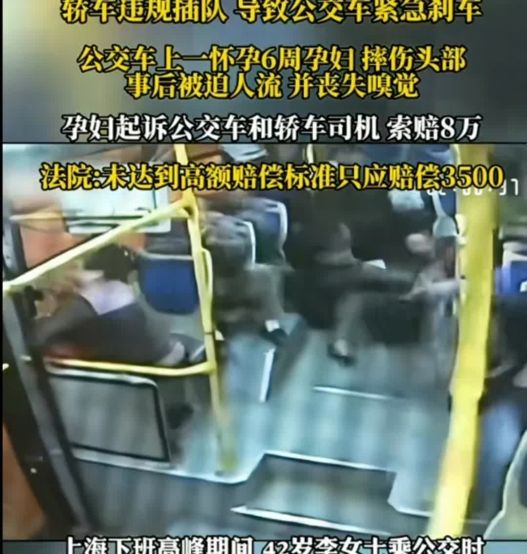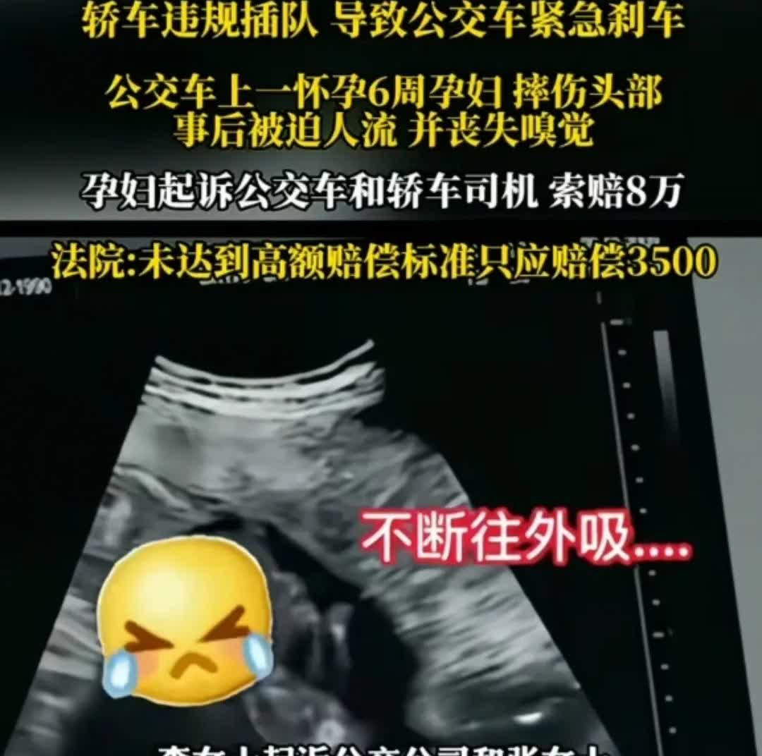 搞笑的勒!被迫人流、头部摔伤、丧失嗅觉,法院居然只判赔偿3500。 上海,42岁的李女士下班后选择坐公交车回家,没想到中途遇到另一个女子开车插队,公交车为了躲避那个女子紧急刹车。 这一刹车,措不及防之下,令很多人被甩的横七竖八,李女士也不例外。 她被摔伤头部,事情发生后,李女士不舒服到医院检查,却发现更令人糟心的事,她丧失了嗅觉。 然而损失远不仅如此,她被查出怀孕六周,本应该是件高兴的事,却因为GT检查以及用药的原因,只能被迫放弃这个来之不易的孩子。 李女士一怒之下,将公交车司机以及轿车司机一起告上了法庭,索赔8万元。 但是法院确认为没有达到高额赔偿的标准,只应赔偿3500。 这3500认真的吗?一个孩子悄悄的来了,他想给父母一个惊喜,但父母知道的时候却只能放弃他,想想都难过,更何况李女士还失去了嗅觉。去医院看病以及休养的费用都不止这些。