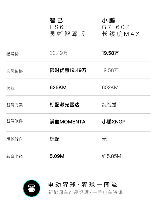 1️⃣价格:智己LS6指导价20.49万,新出的灵犀智驾版限时优惠后 19.49 万,续航625km,小鹏 G7 602 长续航 Max 版 19.58 万,基本同价