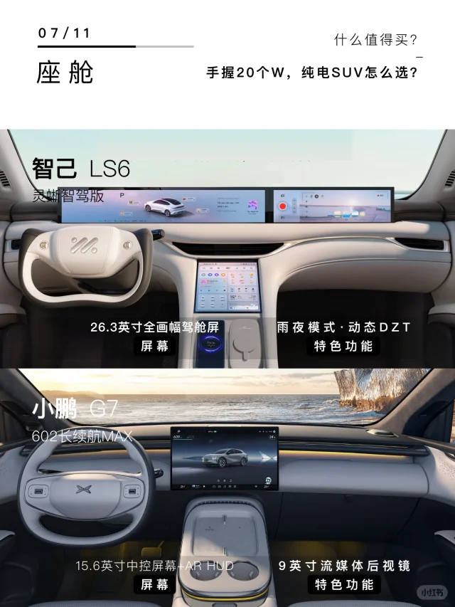 4️⃣车载屏幕:智己 LS6 是 26.3 英寸全画幅驾舱屏,还有雨夜模式和动态 DZT,转弯时能高亮潜在危险,像个贴心小保镖。小鹏G7是15.6英寸中控大屏,还有AR-HUD 和 9 英寸流媒体后视镜,各有特色