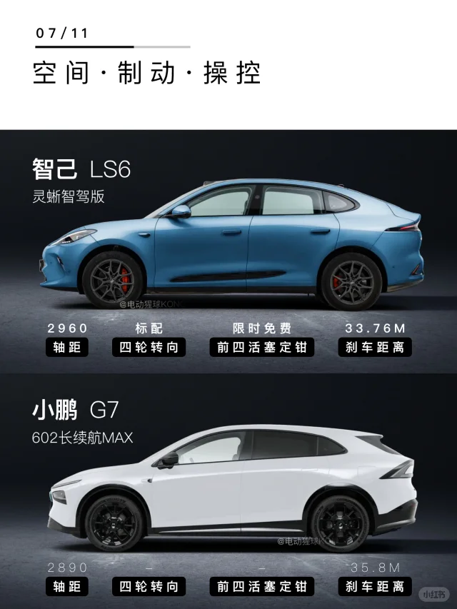 6️⃣底盘:智己 LS6 标配软硬件升级的爆胎稳定控制系统和四轮转向,转弯半径仅 5.09m,停车、转弯更灵活,还限时免费送品牌前四活塞定钳,刹车距离 33.76m。小鹏G7刹车距离 35.8m,也非常不错