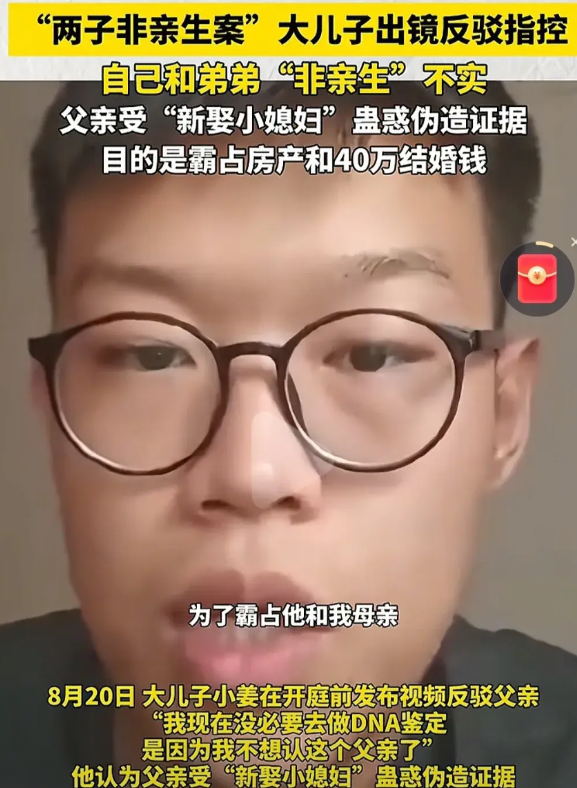 大儿子不承认非亲生,四次拒绝法院要求的亲子鉴定,反咬姜先生婚内出轨,抛妻弃子,被娇妻蛊惑,就是想保住手中的房产和母亲给的40万结婚钱。