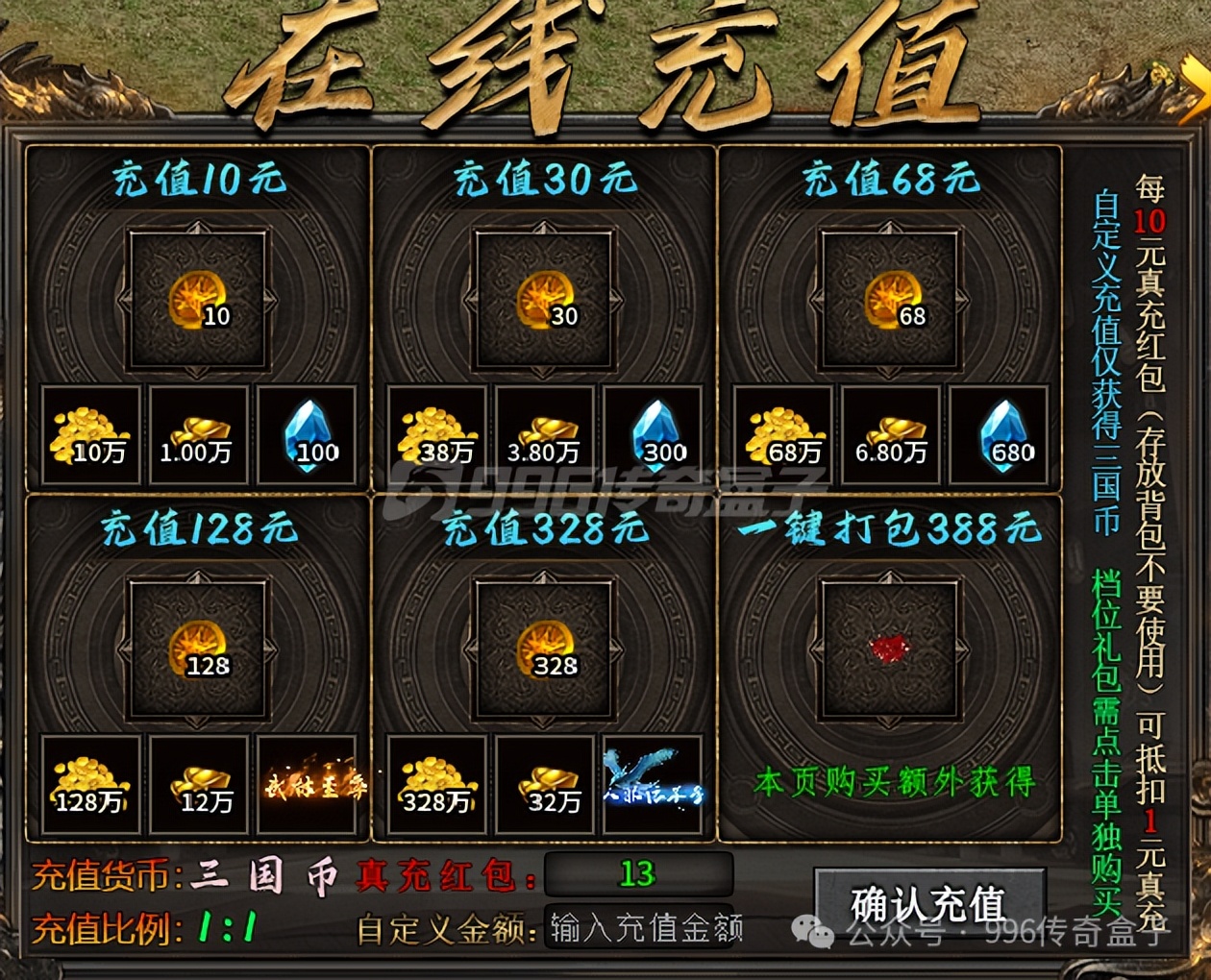 真充红包:真充红包不要用,不要用,不要用,重要的事情说三遍!这个真充红包挺容易获得,散人福利中会给,地图中击杀BOSS几率掉,但是,不要用。双击使用会给累积充值和三国币,不使用可以购买在线充值里面的礼包。是的没错,放在背包里,可以购买在线充值礼包,10个充值红包抵扣一元真充,里面有两个称号,属性很不错,建议攒攒买了!