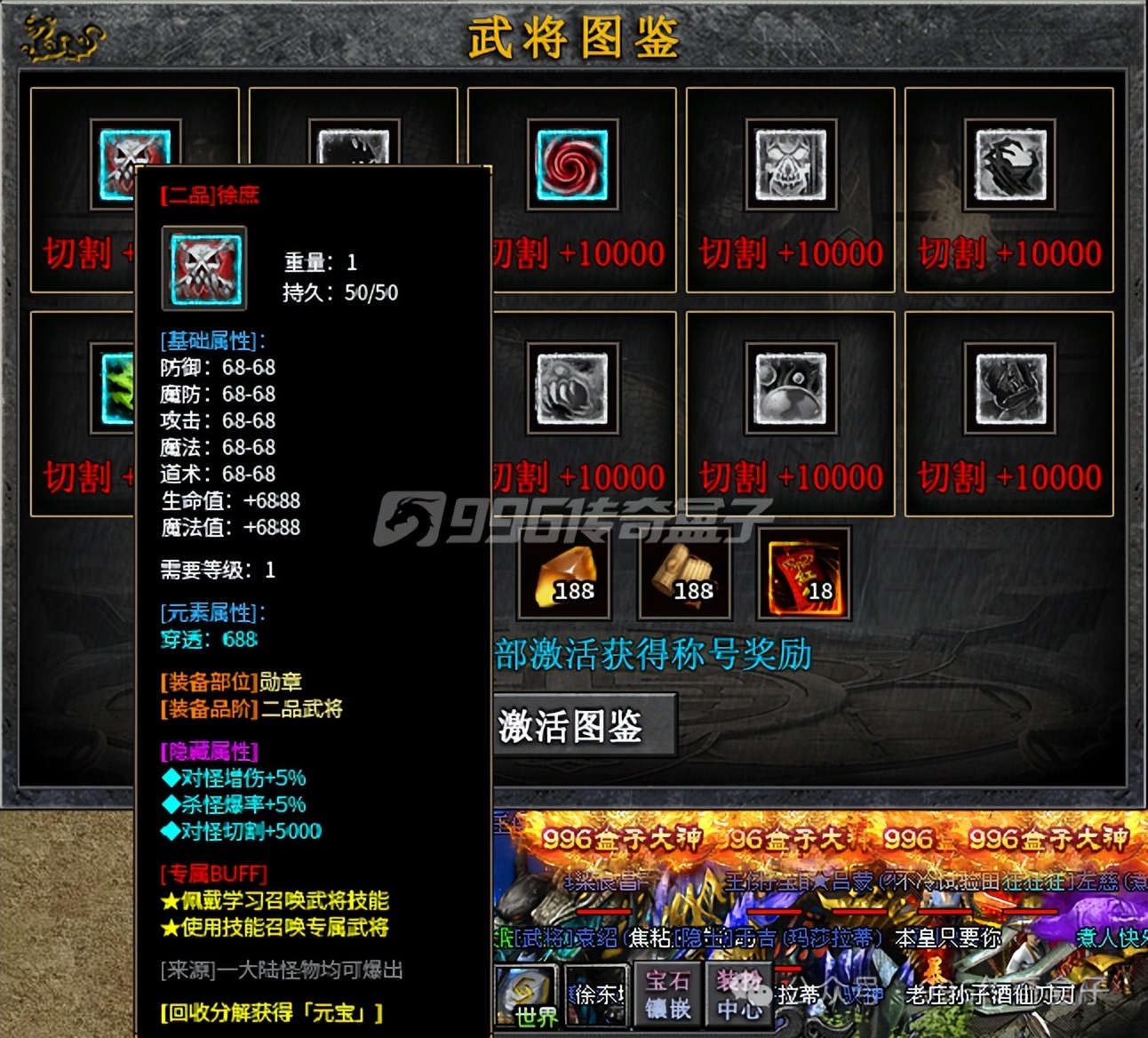 武将勋章打怪会掉,像装备一样,可以设置装备比较,自动穿戴。多余的可以提交武将图鉴。单个提交每个加切割属性,全部提交激活可以获得真充红包和称号,还有其他材料奖励,可以进武将地图!