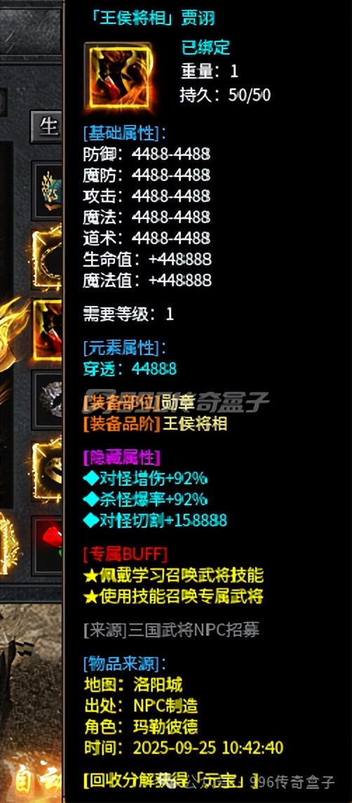 武将勋章:这个服三国的元素很多,其中武将勋章是重点。这个可以刷怪爆,也可以用三国币抽取。佩戴在勋章位置,每个武将都有不同的武将技能,佩戴就可以召唤该武将并肩作战,相当于带了个宝宝!