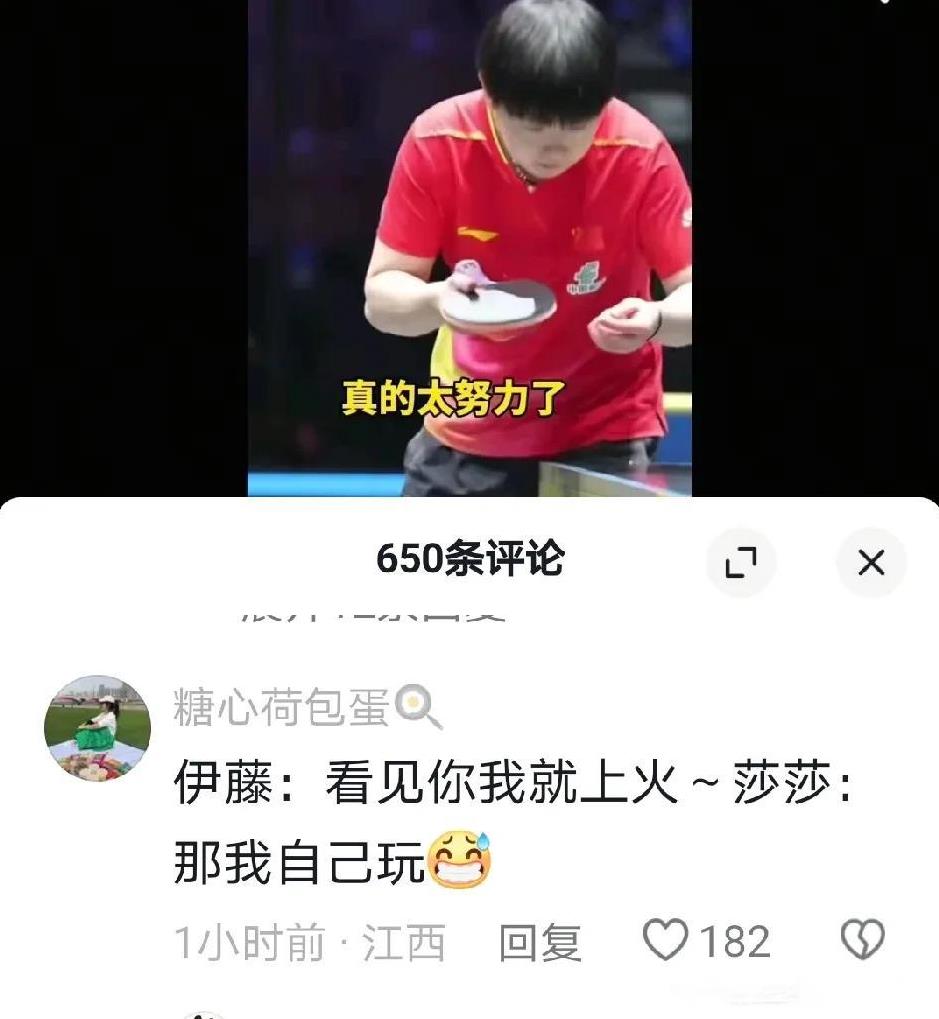 伊藤美诚流鼻血是孙颖莎发现的。 孙颖莎和伊藤美诚热身完毕,莎莎在擦球看看伊藤美诚是否准备好了时,发现她的鼻子出血了。于是她向裁判示意伊藤美诚鼻子出血了。 伊藤美诚去止鼻血时孙颖莎就自己在球台边热身。有网友说:莎莎不想让球迷干等着,我要表演一回真正的单打。网名叫“糖心荷包蛋”的网友还用伊藤和莎莎的口吻调侃留言。伊藤:看见你我就上火。莎莎:那我自己玩了! 别说,真正有意思的内容都在评论区了。