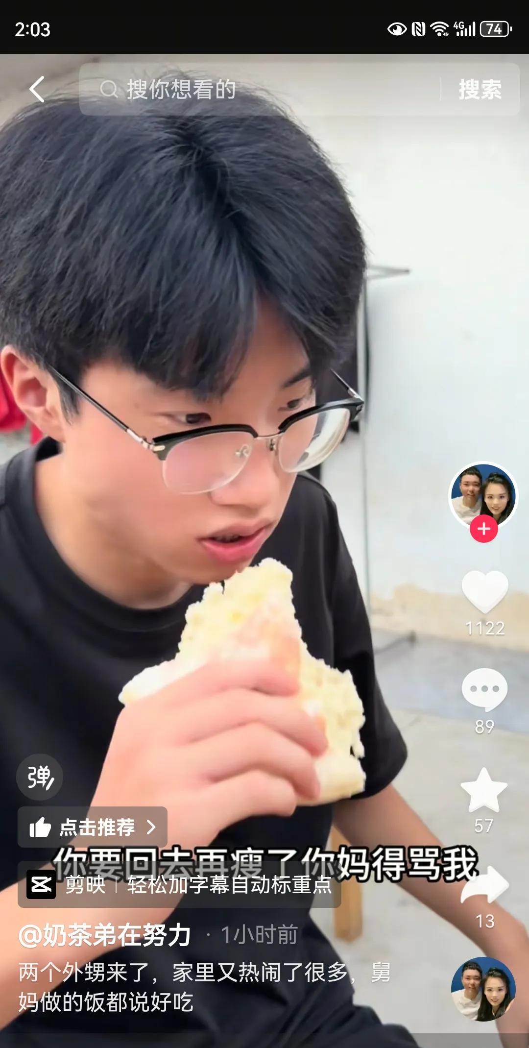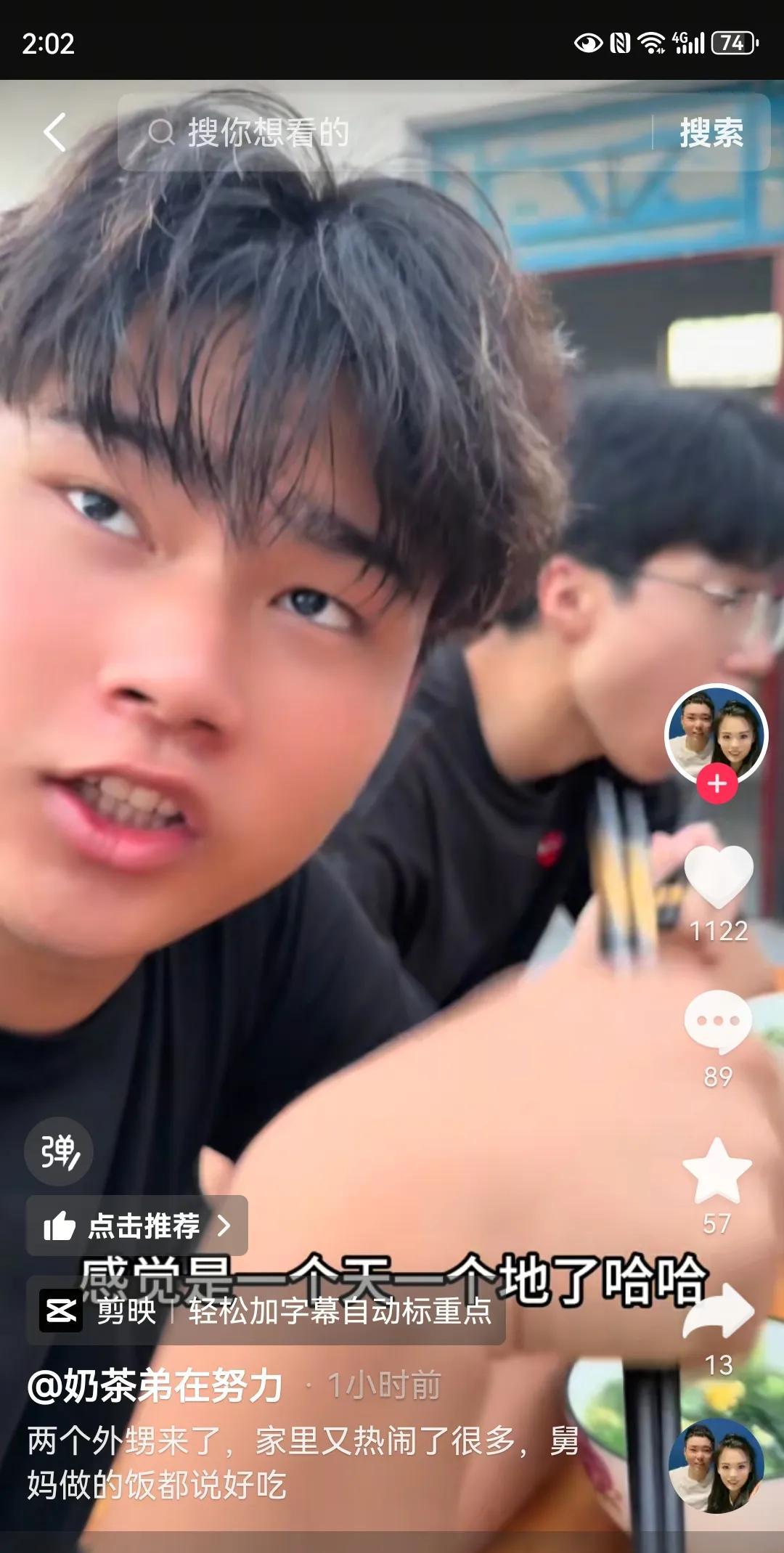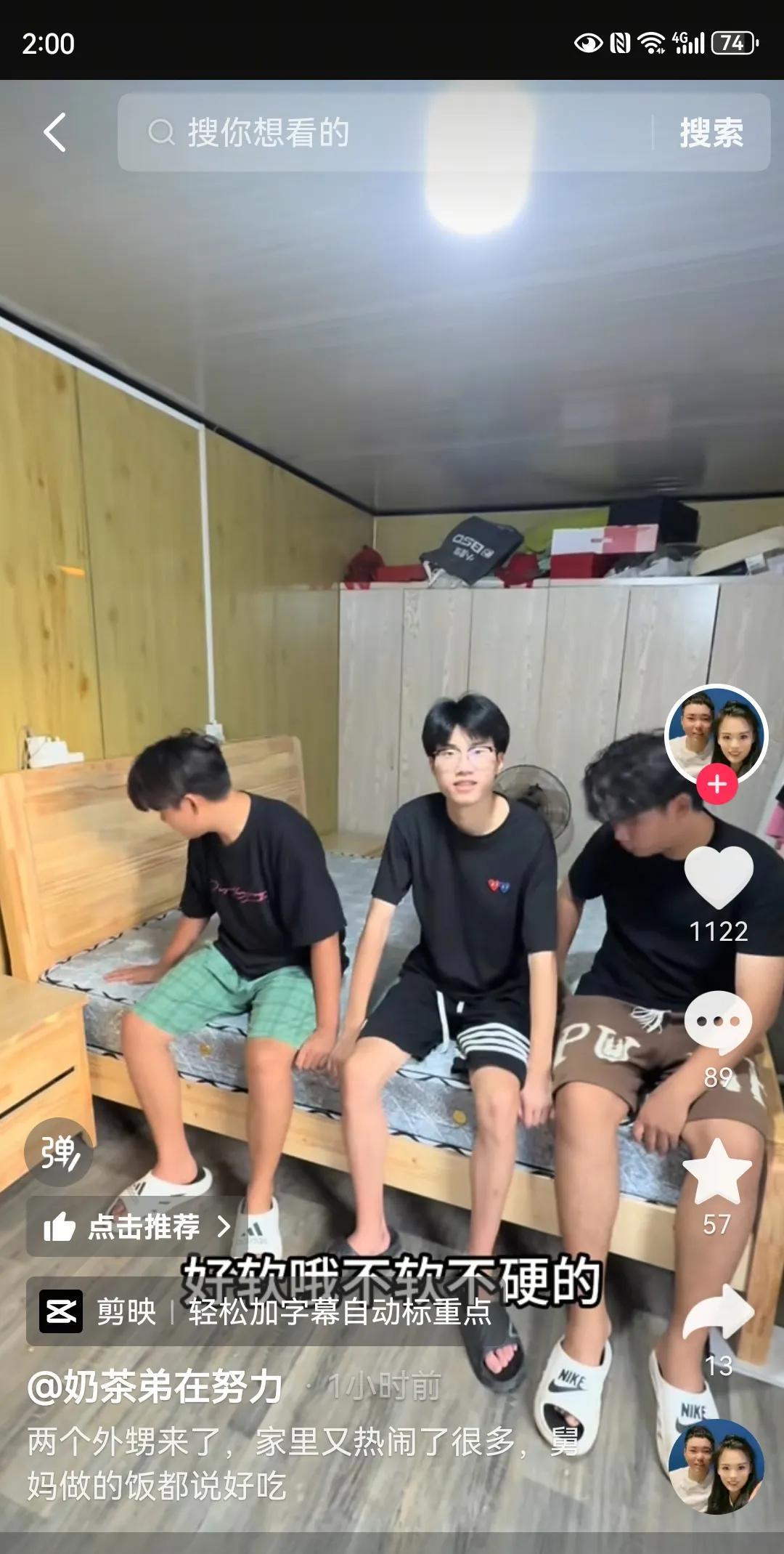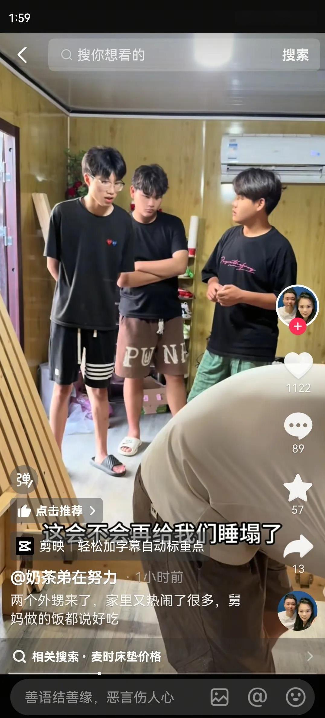 大双这好舅妈,给孩子做次饭都得拍两集。 奶茶弟真相了,网上买的东西不好,他在网上买的床就不结实,所以选择在实体店买贵的。那他们一年四季都在网上卖东西,质量好吗?他的房,车,赌债都是靠网上赚来的,连老婆都是看他赚到钱了才回来的。 仨孩子出镜,吃了一餐舅妈做的饭,还提供两集素材给他们,没有一口饭是白吃的。奶茶弟采访李子昂:你尝尝你舅妈做的好吃还是你妈做的好吃?高情商的李子昂也不装了,直接来句:一个天一个地!给舅妈好评就顾不上自己的亲妈了。可惜,做饭好吃的舅妈也就做了一餐饭给他们,要不是二姐走时去看他们的视频先发出来,就没人知道有老爷子感冒了靠玉米粒充饥,仨兄弟下午三点还在铁皮房里睡觉的画面。这四爷孙都是需要出镜了就有人做饭给他们吃,平时就他们守在老家饿肚子。 不知大家有没注意到,对于仨兄弟住在外婆家,所有人都没意见,都很乐意。只有老爷子是气不打一处来,一直在用方言吐槽仨孩子。那天二姐去看大儿子的时候,老爷子也说过让她带走,但全都没把他的话当回事。这群人又都快要回到家族里没做自媒体以前的状态了!