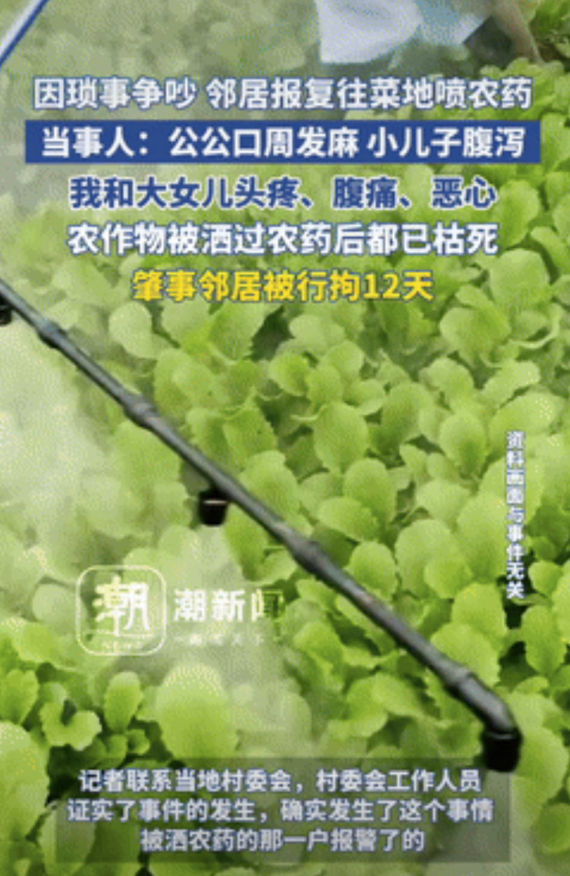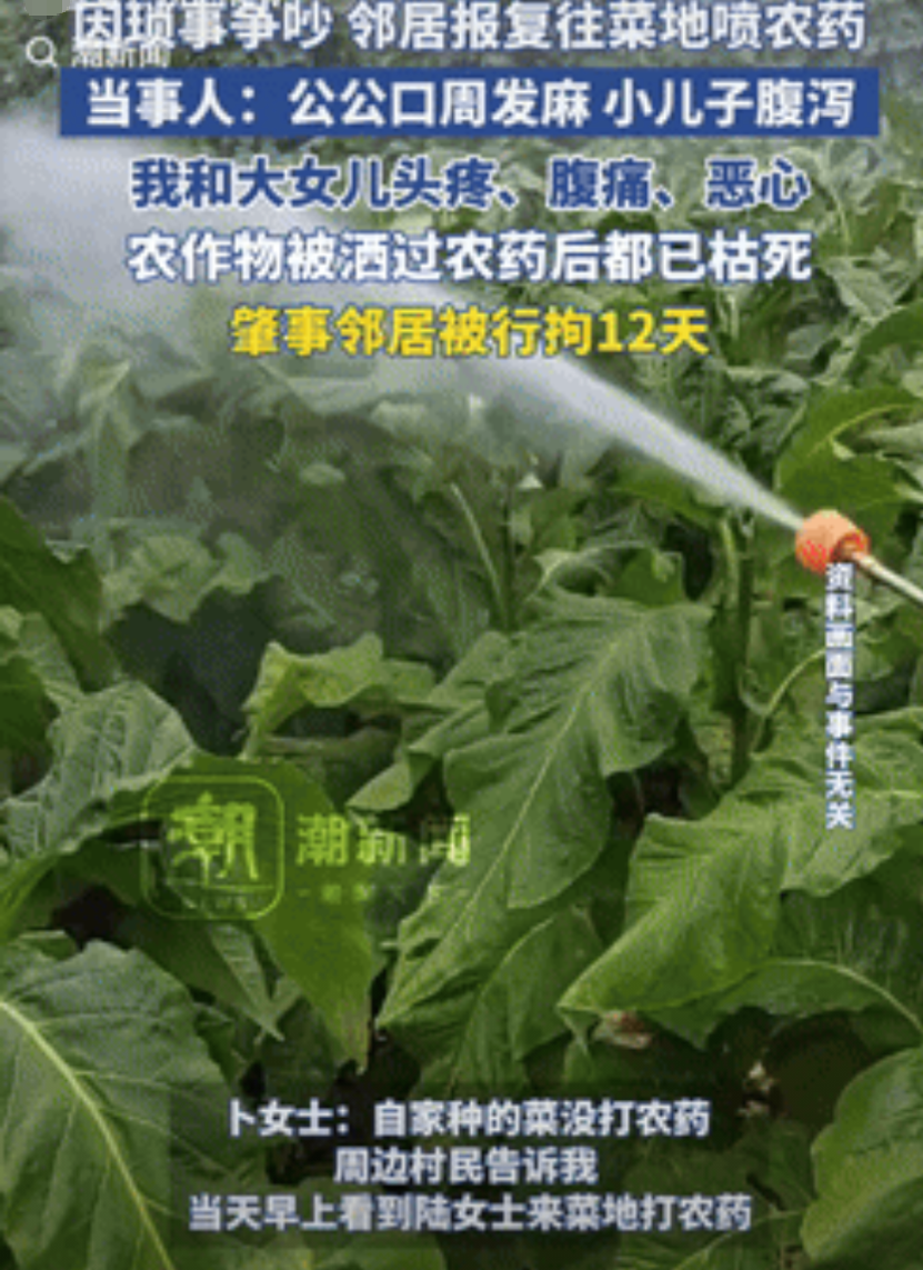 人怎么能这么恶毒!江苏启东,一老人因一点小事,和邻居大吵了一架,不料,邻居却因此心怀不满,往菜地里撒农药来报复,结果老人一家4口吃完后,全都被确诊为中毒,差点要了命!网友:遇上这样的邻居,可真够倒霉的! 据潮新闻8月22日的报道,老人出门散步的时候,刚好遇到了邻居,结果俩人在闲聊的时候,因琐事发生了争吵。 本来这也没啥大不了的,亲人之间都会吵架,更别说跟外人了,双方各退一步不再计较,这事就过去了。 可没想到,邻居却因此怀恨在心,于是在某天早上,她背着农药喷雾器,来到老人家的菜地里,往蔬菜上面打农药。 而在第二天的晚上,老人的儿媳就过来摘了些番茄,等回到家后,只是简单的清洗了下,她和3个孩子就吃了。 随后过了一段时间,几个人都感到头晕恶心,肚子还特别疼,到医院检查过后,发现是农药中毒了。 所幸农药的毒性并不致命,经过一段时间的治疗后,全都康复出院了,而回到村里后,儿媳就从其他人的口中,得知事情发生前,邻居曾去过菜地打农药。 在意识到这是有人故意做的后,儿媳赶紧到派出所报警,在面对警察的询问时,邻居也如实承认了自己的行为。 如今当地警方回应,对邻居做出拘留12天的处罚,也不知这个是否是最终的处罚结果。 那么对于这件事情,您有什么想说的呢?