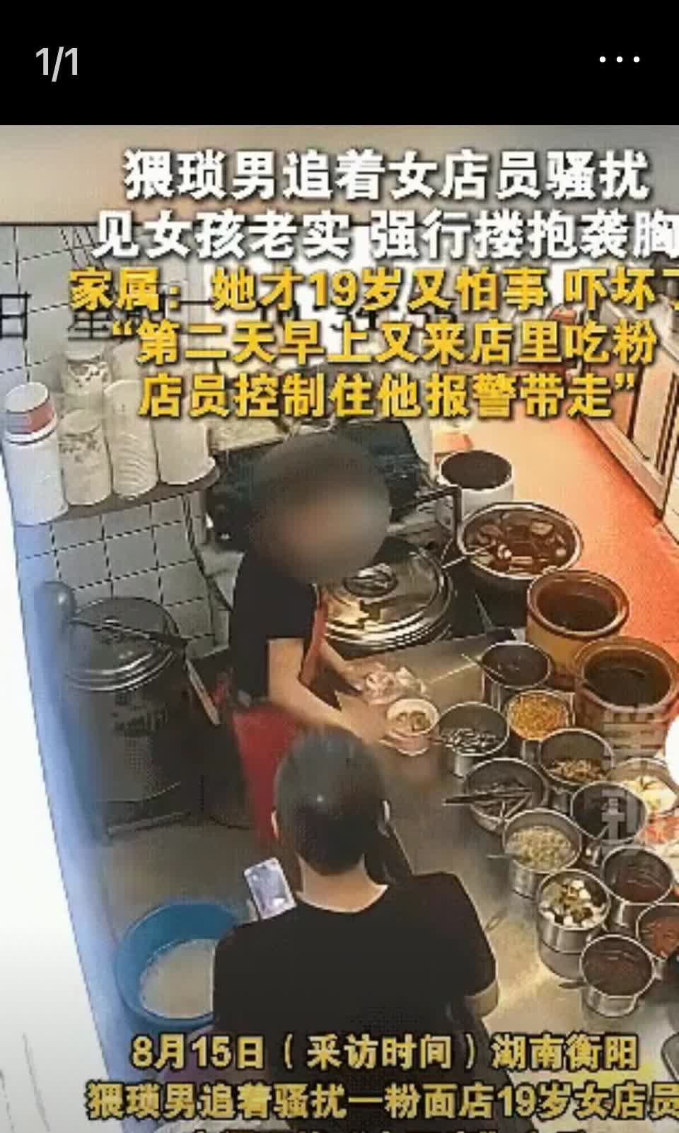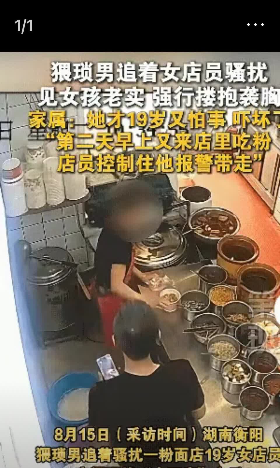 遇到这样的事情,你会怎么办? 湖南衡阳一男子去米粉店吃米粉,看见女店员年轻漂亮,便起歹心,说要带她去开房,女店员吓得躲进厨房,男子穷追不舍,又是搂抱,又是摸胸。更可恶的是,第二天,他又来了,故技重施,可惜这次他栽了跟斗。刚有动作,就被控制,交给警方带走。等待他的,将是法律的严惩! 人所以为人,是因为我们和动物有本质的区别,我们有发达的大脑,强大的思维,辨别是非的能力,有道德和法律底线,知道什么事可以做,什么事绝对不能做,否则,你就可能付出自由,甚至是生命的代价。 就像上述男人一样,看见别人漂亮,就失去理智,管不住自己的行为,这哪是一个正常男人所为? 在此,也提醒所有的女孩子,遇到这样的色狼,绝对不可以忍气吞声,该反抗必须反抗,该报警必须报警,不能让他们得寸进尺,让自己陷于被动,遭遇危险。