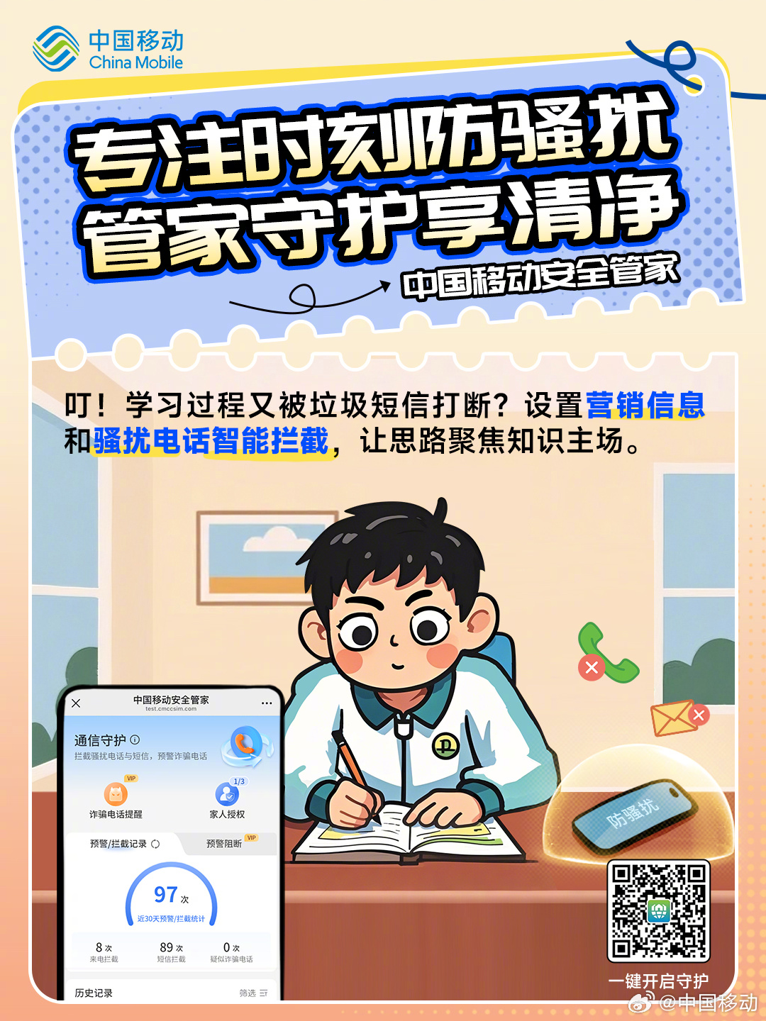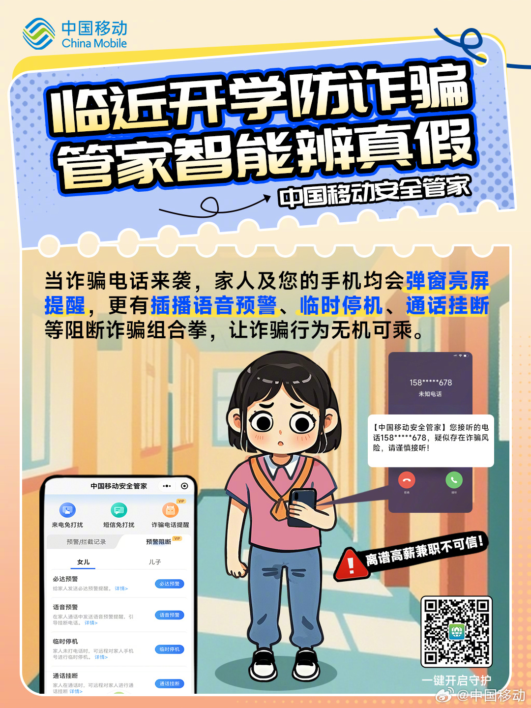 #开学季# 即将来临 中国移动为您贴心奉上开学“省心”四件套 速来查收↓↓ 校外行踪“千里眼” 熬夜上网“终结者” 垃圾信息“清道夫” 诈骗来电“粉碎机” #中国移动安全管家#