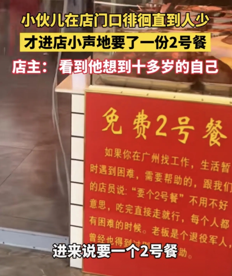 一名来广州打暑假工的少年在饭店门口徘徊了7、8分钟,一直没敢进去,在确定店里没几个食客,才进入店内怯怯的问老板娘要了一个“2号餐”。吃完还很有礼貌向老板鞠了一个躬并说了一声:谢谢,才走出店外。