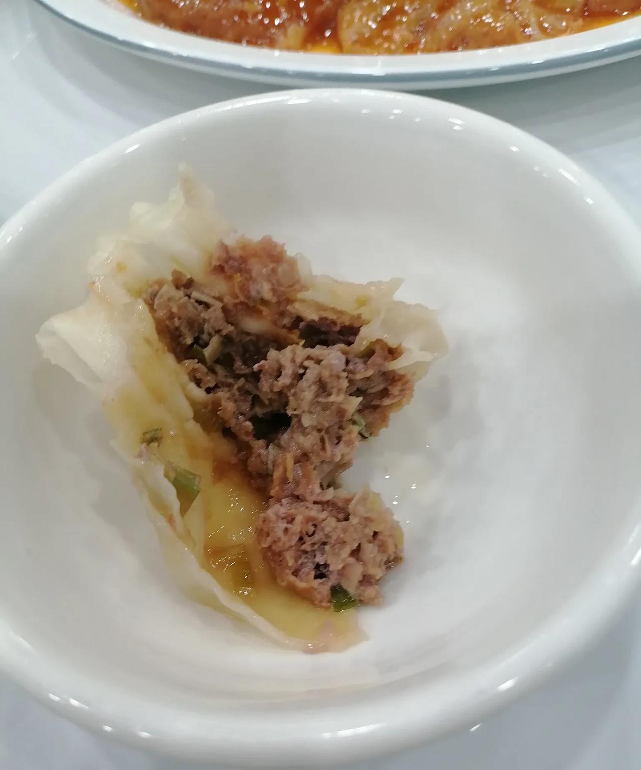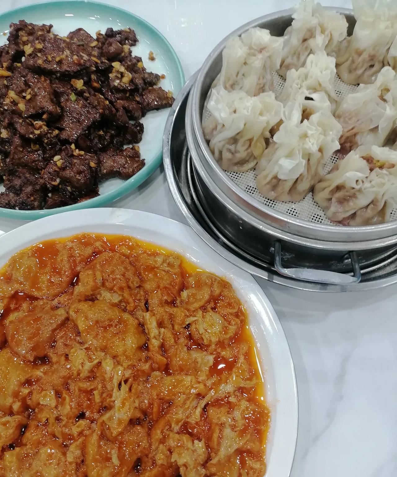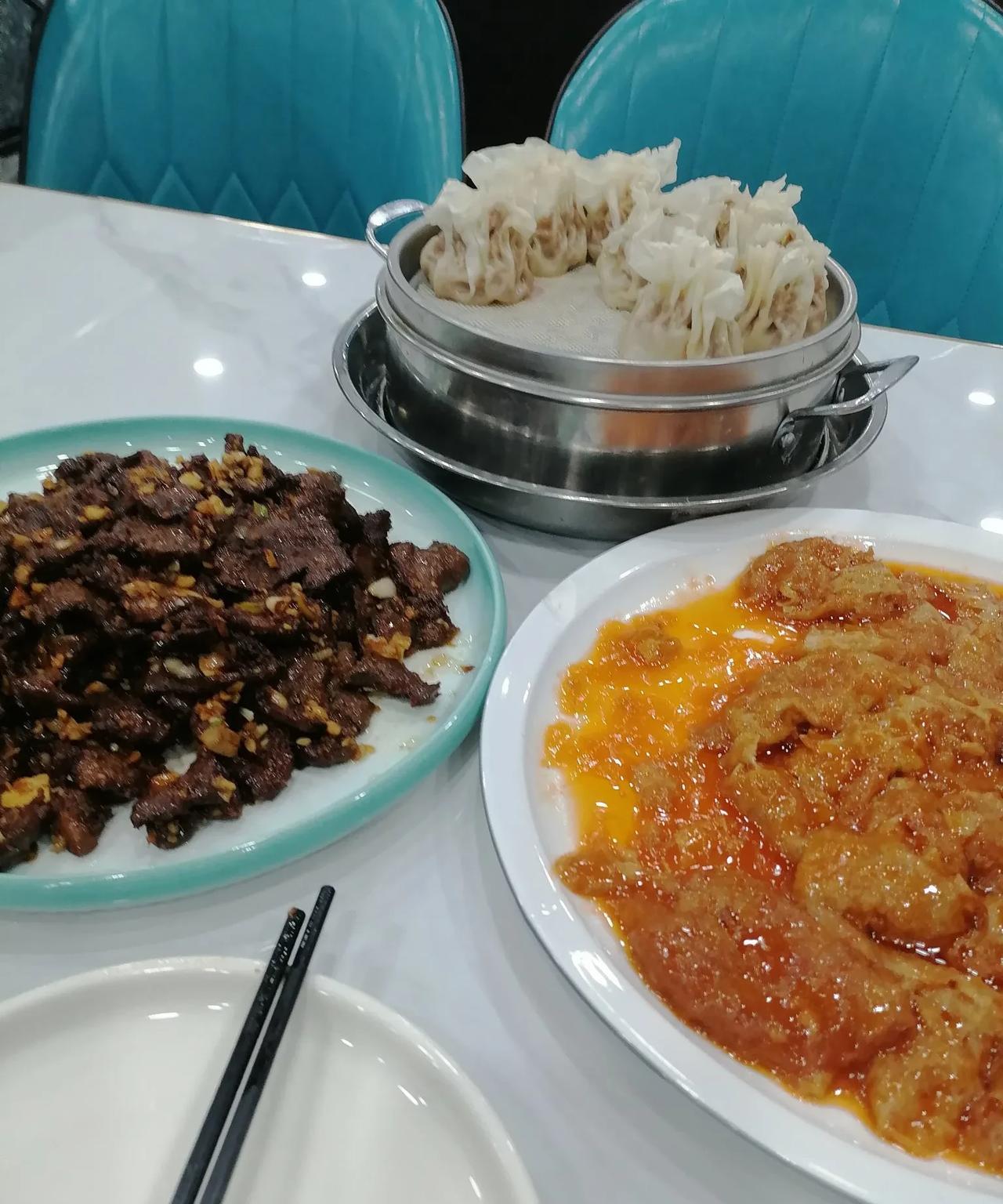 【随手记,菜量很大的军发号】 坐标,天津南开咸阳路(嘉陵道口) 昨晚秋雨凉,没有饿感,干脆拿了雨伞出门雨中散步,从快速路向南,走到咸阳路嘉陵道附近,看到一个叫军发号的招牌,感觉有点儿饿的感觉了。 进去一看人不多,可能是因为下雨吧,角落里有两桌,一桌是一男一女,另一桌是小三口。老周就点了一荤一素,老爆三、笃面筋,又点了一屉羊肉烧麦。上菜之前,我见有小孩儿,就冒雨出去抽了根烟,回到屋里,那两口子当着孩子一人叼着根烟,我无语。 羊肉烧麦不错,而且个儿大,跟炉饺子的个儿差不多,肉鲜而有汁水,让人吃不停。两个菜么,味道只能说,说得过去,跟天津西北角的,不像是一个师父。 重点是,这家的菜量太大了,碟子虽浅,但碟子太大了,像锅盖,老周又倒了一杯酒想多吃点儿,也只吃了菜的四分之一和半屉烧麦,我估计,我即使再带个半大小子,也能吃撑。 看来,在天津开饭馆,太卷了。 咸阳路这家军发号,简直太实惠了。