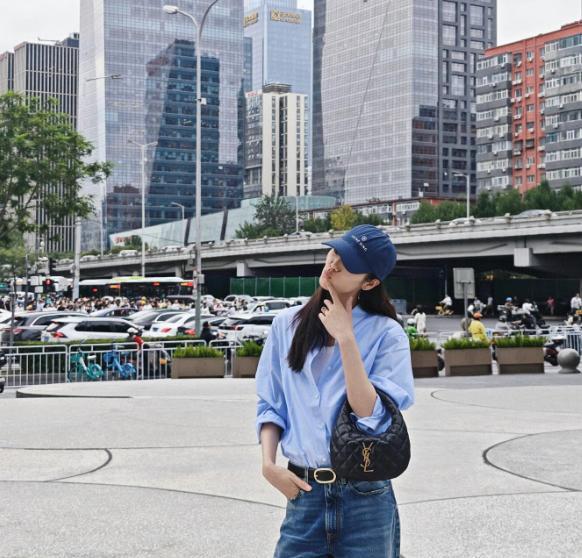 刘雯街头造型曝光:白背心叠穿蓝衬衫,配郑道阔腿牛仔裤与黑腰带,黑人字拖 + 圣罗兰黑包简约随性,腰间拉布布小公仔更添个性,少女心尽显。