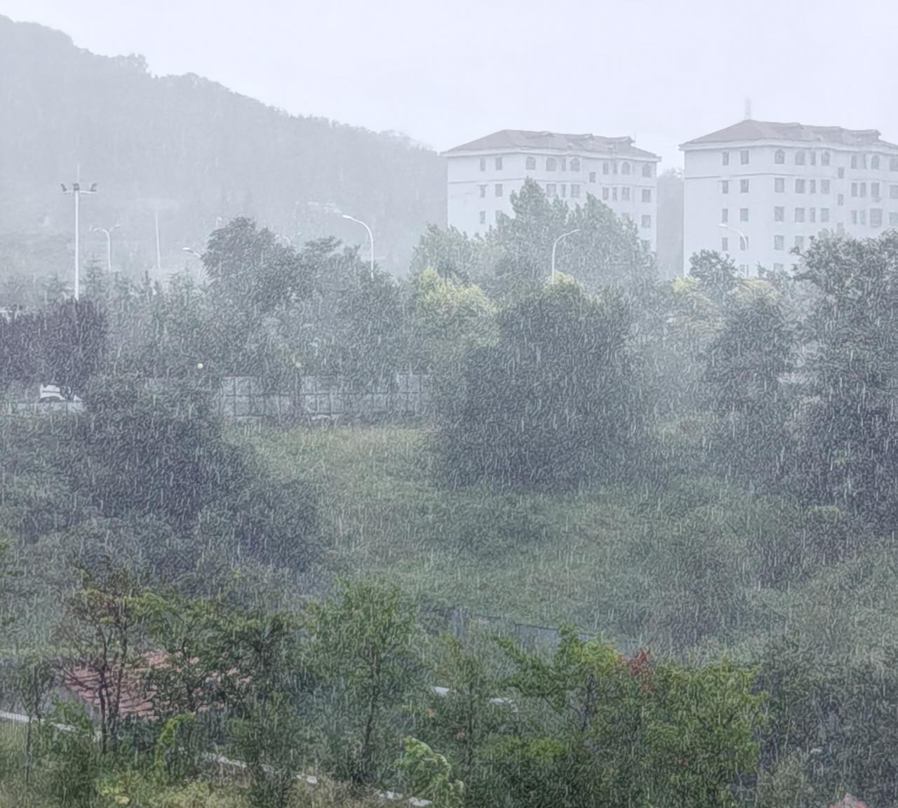 又是突降大雨,又是预报中的“小雨”突变大雨! 凭窗遥望近看,摄入镜头中的是雨点密