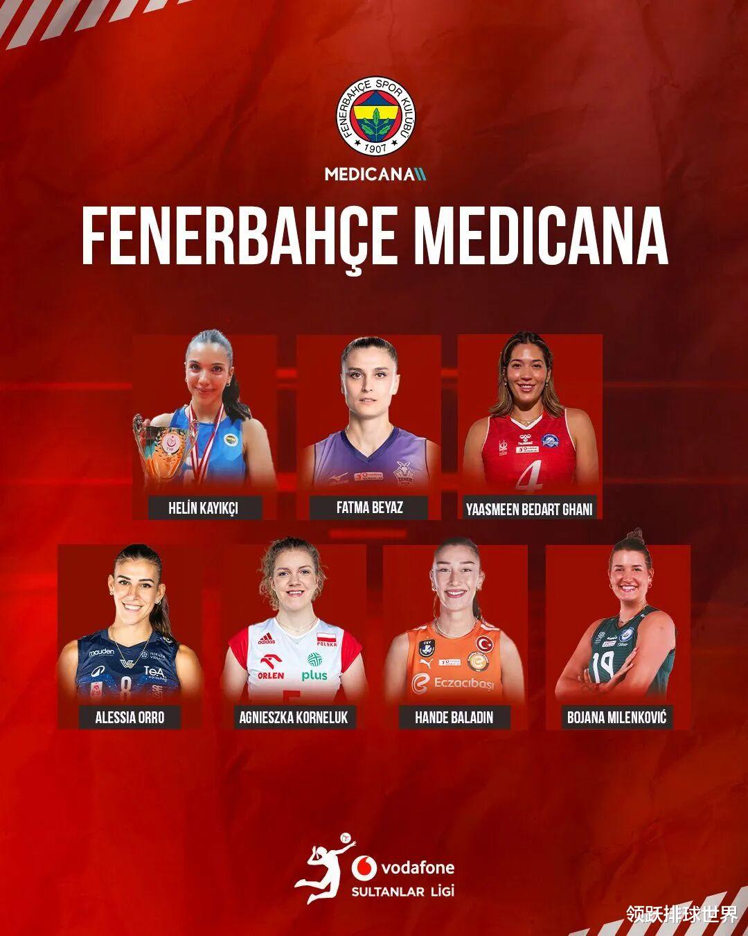 费内巴切女排(Fenerbahçe Medicana),新增外援名单:阿莱西娅·奥罗(意大利)、阿格涅什卡·科涅卢克(波兰)、博亚娜·米连科维奇(塞尔维亚)、雅丝敏·贝达特·加尼(美国)