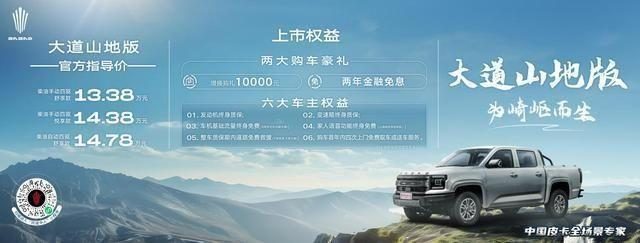 在激烈的市场竞争中,江铃大道山地版的定价区间为13.38-14.78万元,可谓性价比极高。而品牌为消费者带来的购车优惠更是不容小觑,现在订车即可享至高综合优惠17,000元,包括两年金融免息的金融礼、10,000元的增换购补贴。此外,江铃汽车还为车主提供包括发动机终身质保和变速箱终身质保在内的六大车主权益,为购车者带来长久的安心保障。