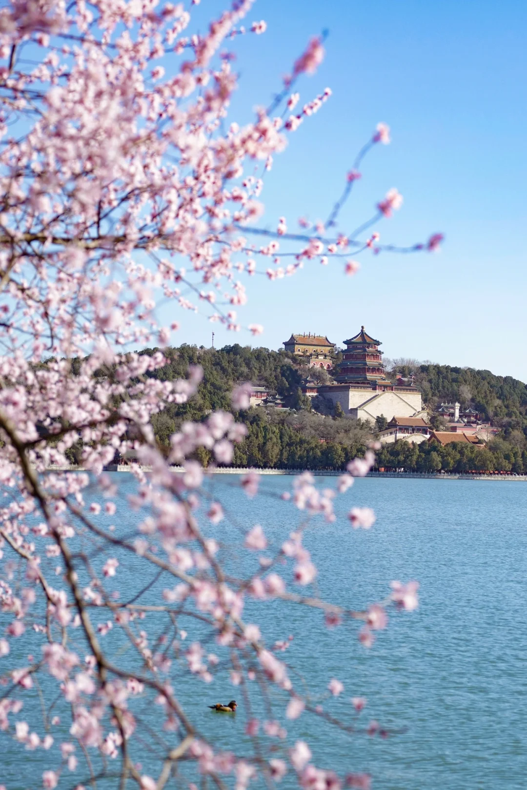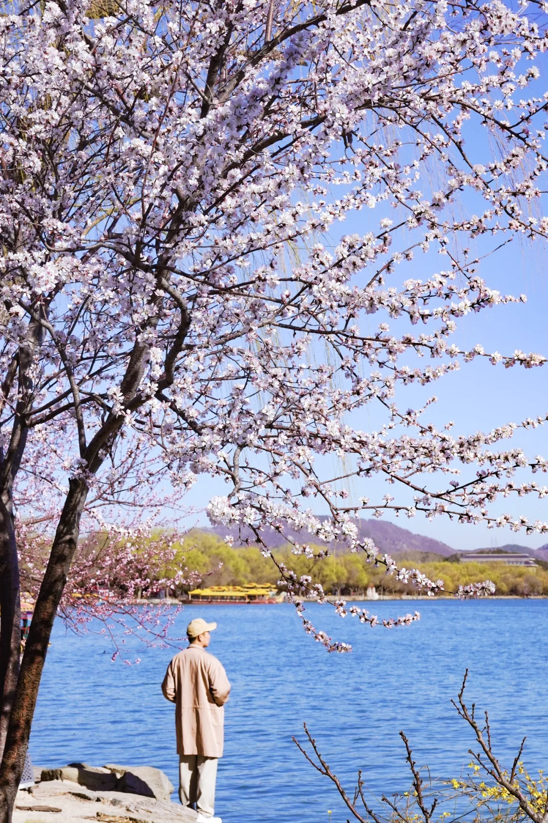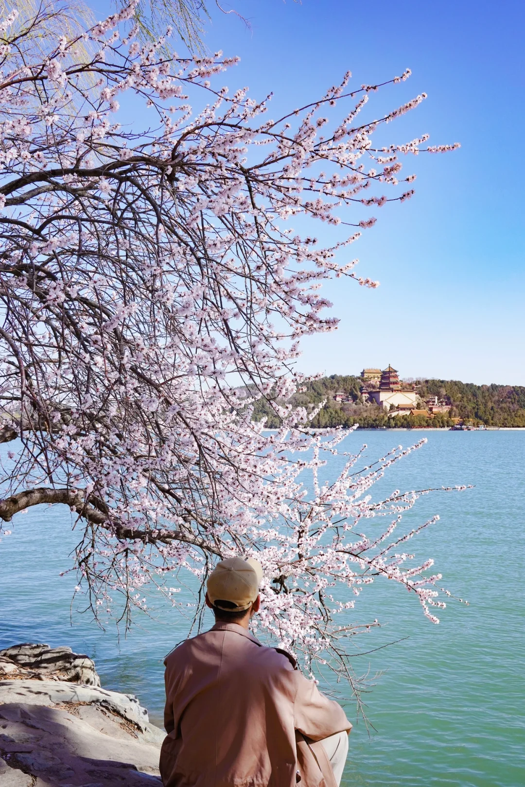 沿着湖边走,能看到桃花在微风里轻轻晃动,花瓣掉下来,飘在湖面上。远处的佛香阁和十七孔桥,在花下搭配得刚刚好。这里拍照敲美,值得期待的地方