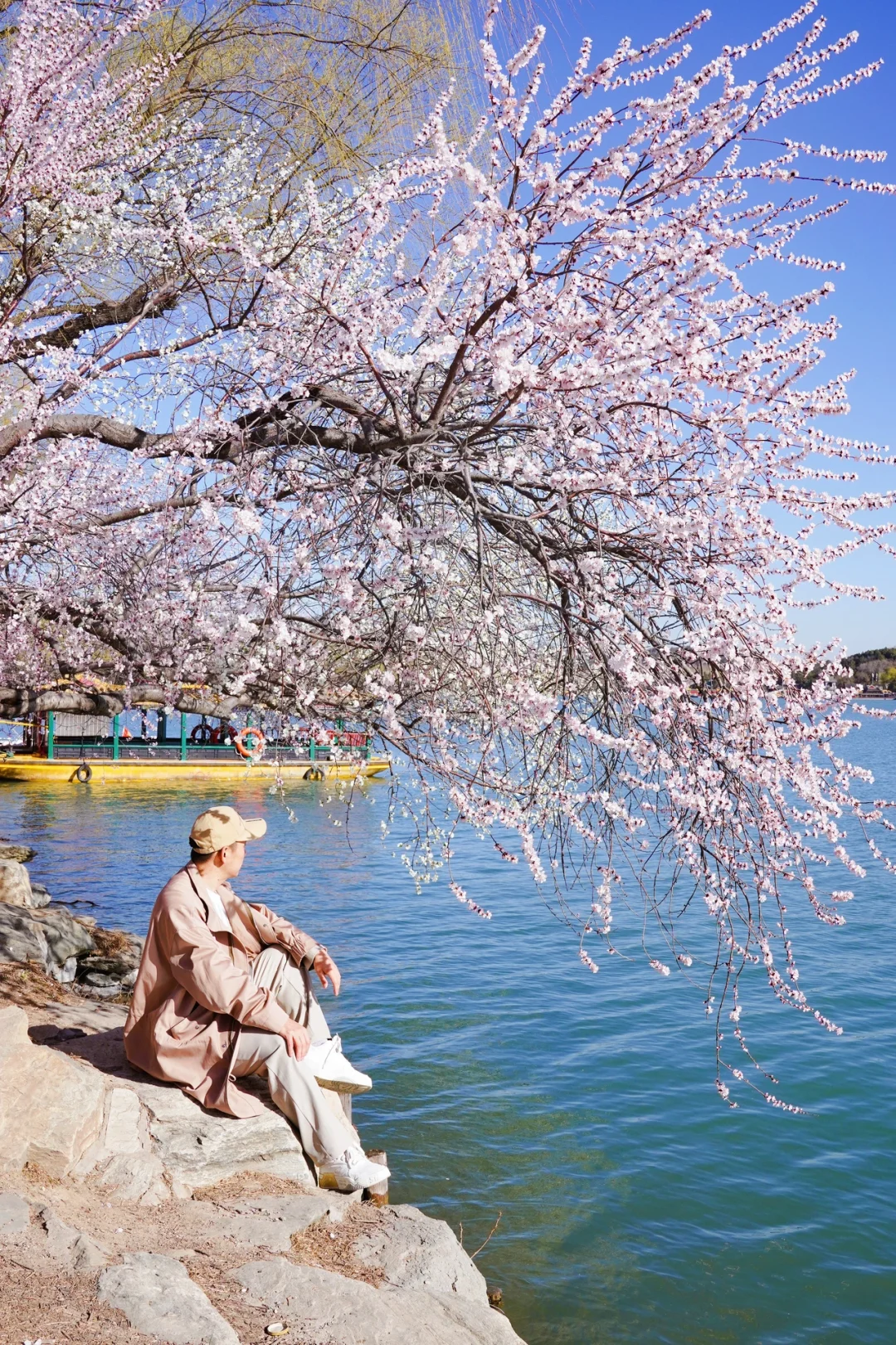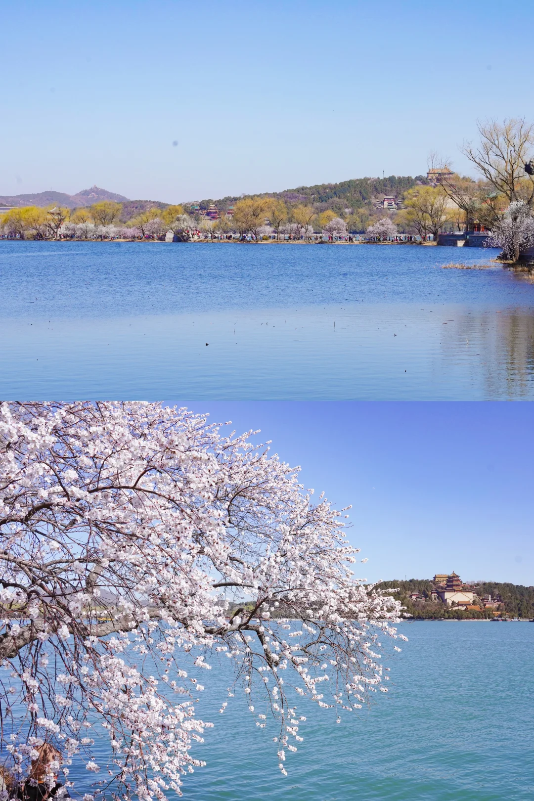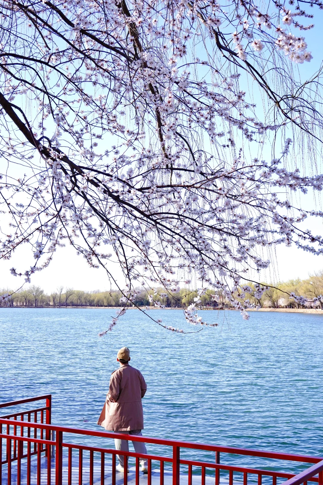 沿着湖边走,能看到桃花在微风里轻轻晃动,花瓣掉下来,飘在湖面上。远处的佛香阁和十七孔桥,在花下搭配得刚刚好。这里拍照敲美,值得期待的地方