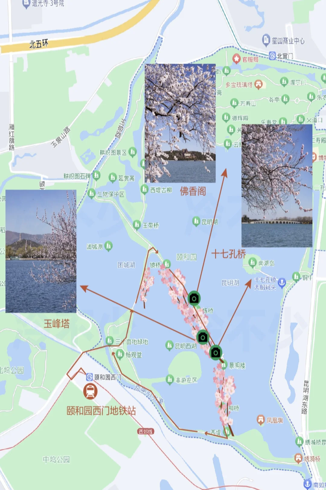🚶♀️🚶➡️颐和园西门进入➡️镜桥➡️练桥➡️颐和园-景明楼➡️西堤,是一条闭合路线
