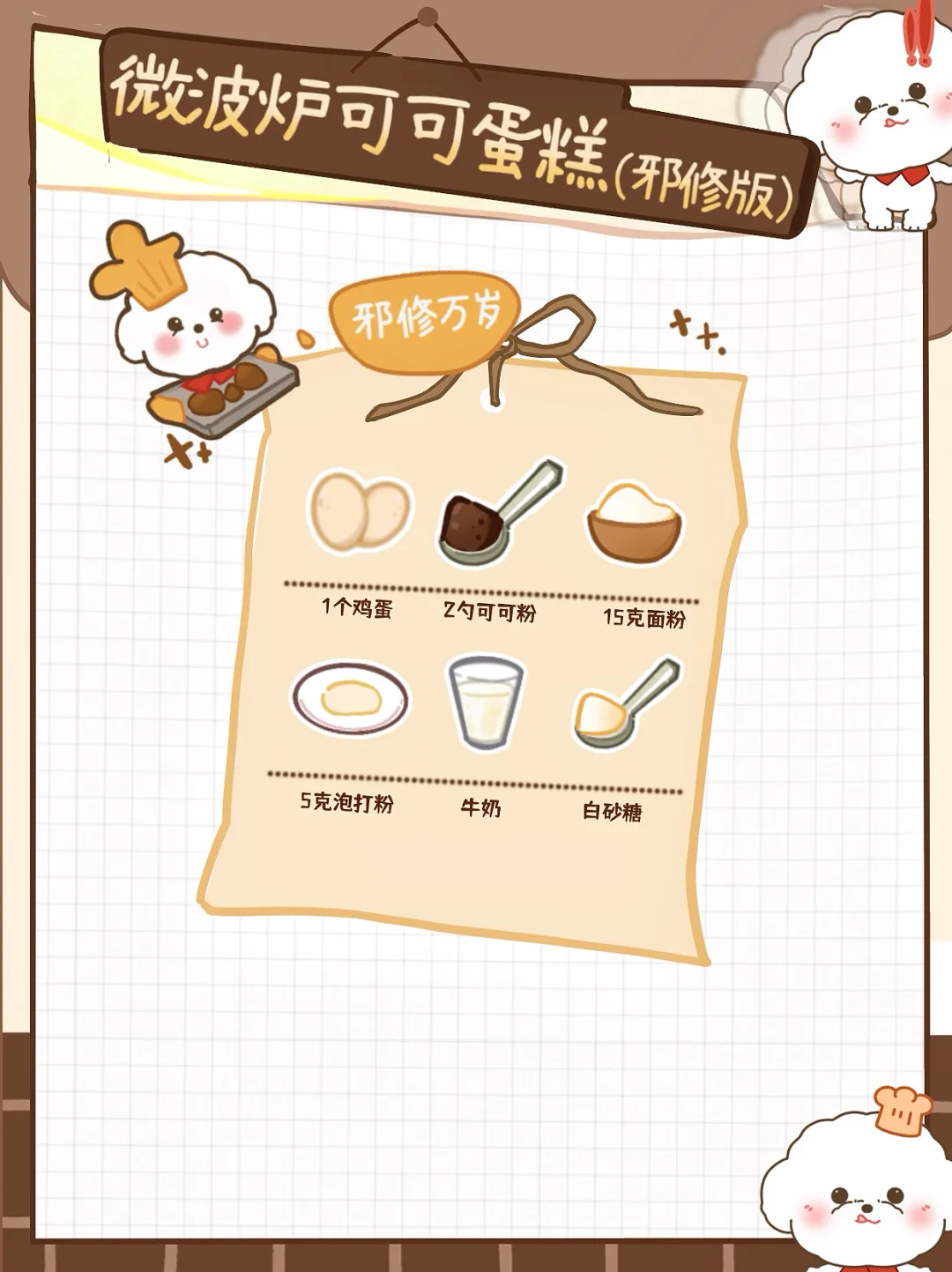 1个鸡蛋➕2勺可可粉➕15克面粉➕5克泡打粉➕牛奶➕白砂糖