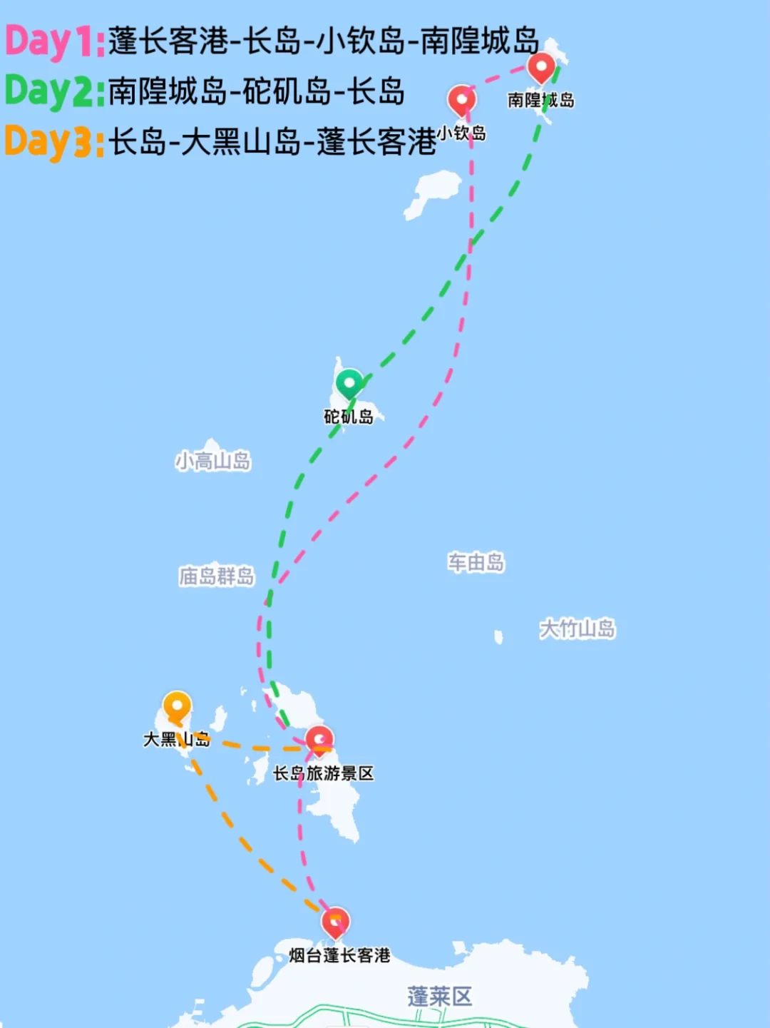 蓬长客港坐船到长岛(45min)➡️乘坐「寻仙6豪华游轮」到小钦岛(2h30min)➡️渔家美食➡️游览小钦岛➡️乘游轮抵达南隍城岛(30min)➡️游览南隍城岛➡️渔家海鲜晚餐