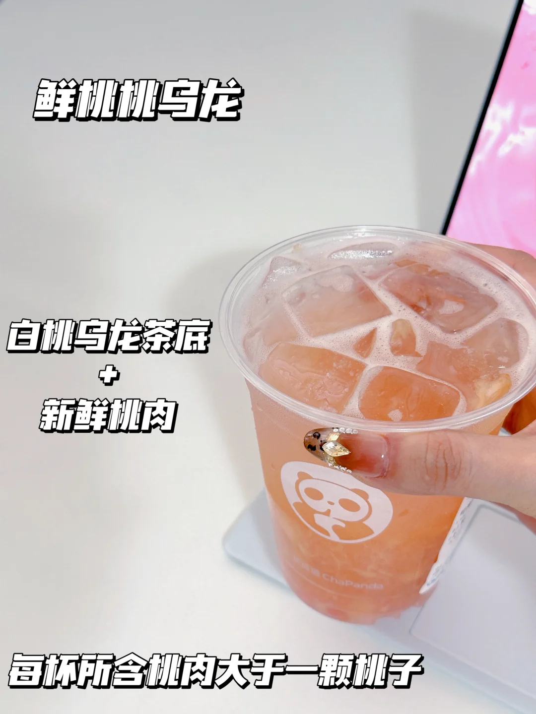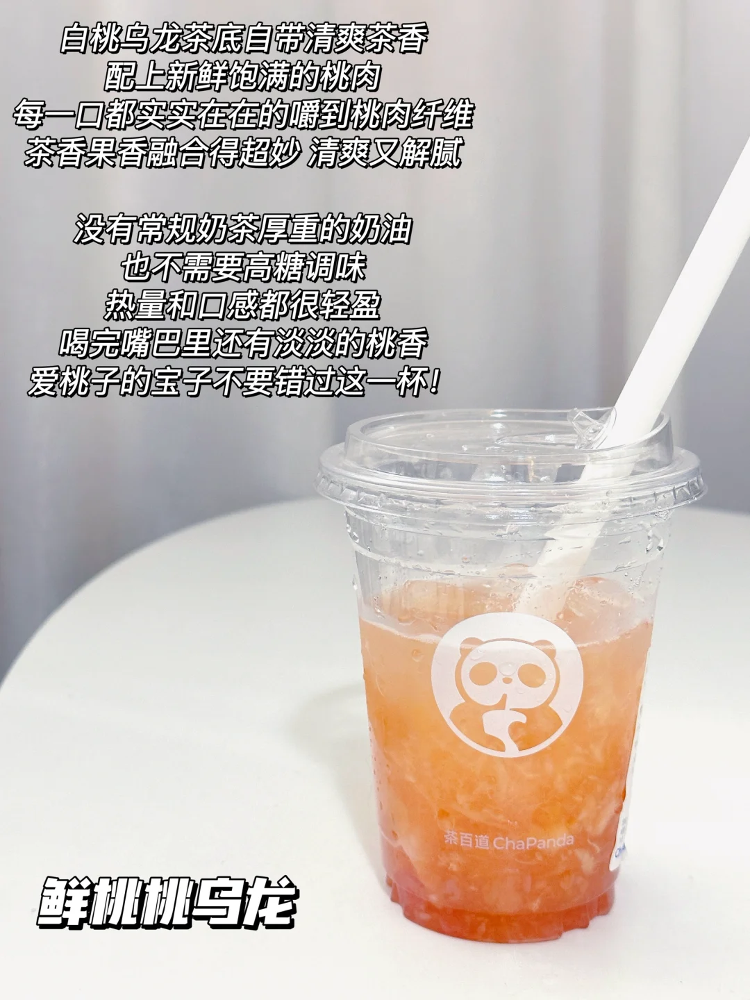 白桃乌龙茶底自带清爽茶香,配上新鲜饱满的桃肉,每一口都实实在在的嚼到桃肉纤维!茶香果香融合得超妙,清爽又解腻〰